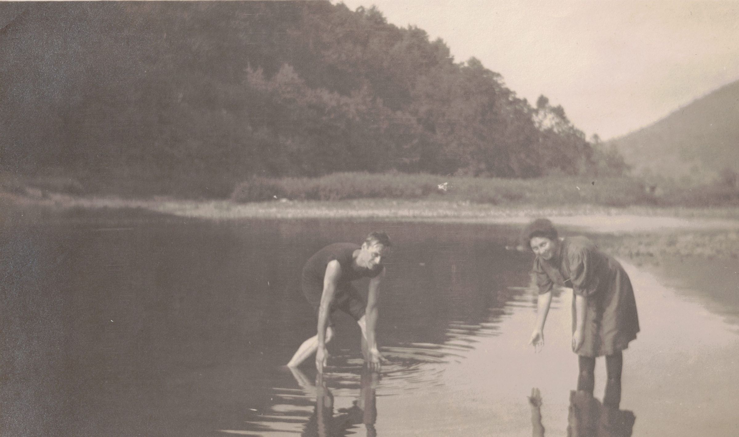 Photograph of William and Tarsilla Schuster in bathing costumes. They are standing in shin deep water and reaching down to put their hands in, smiling at the camera.