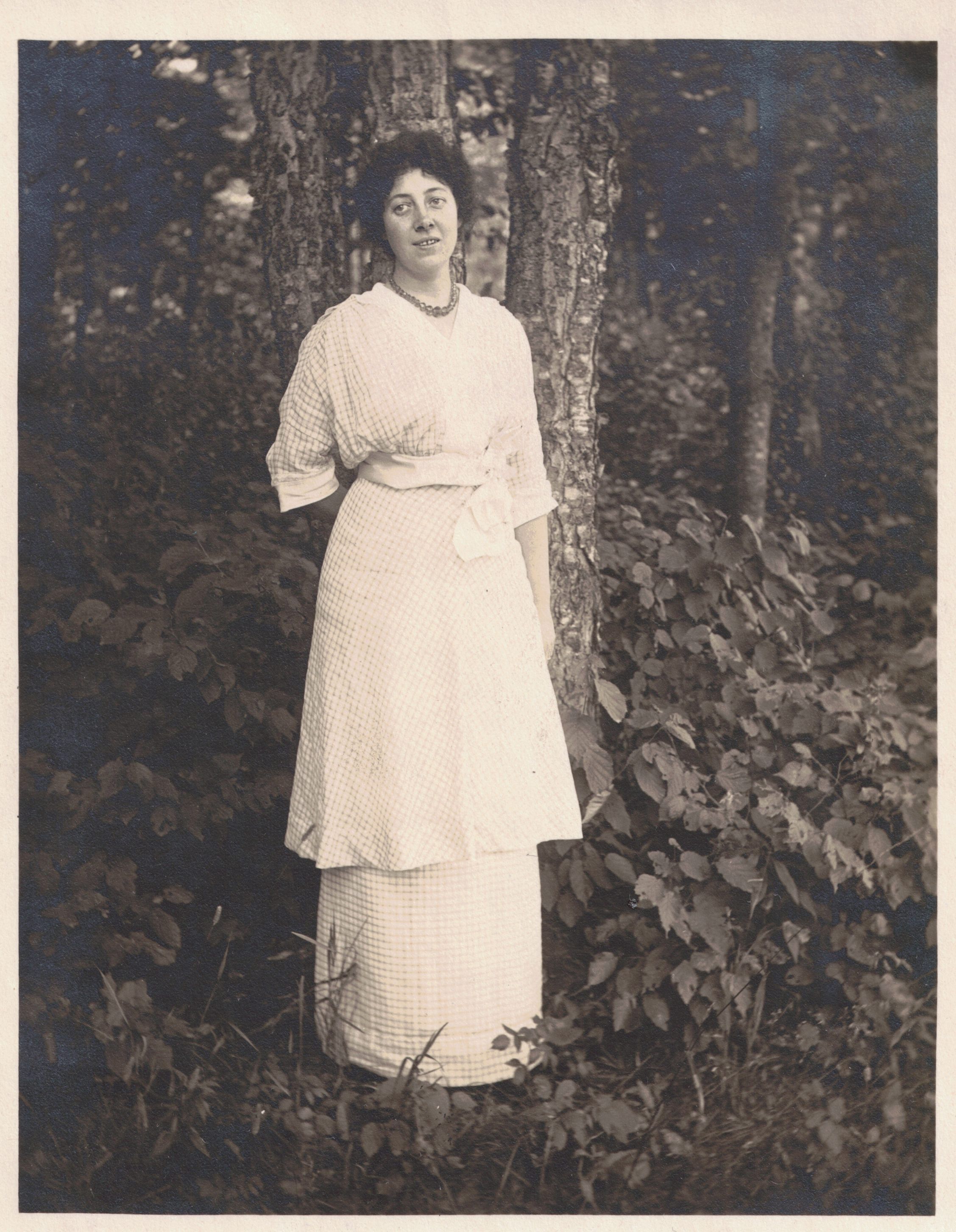 Photograph of Tarsilla Schuster standing by a tree in the woods.
