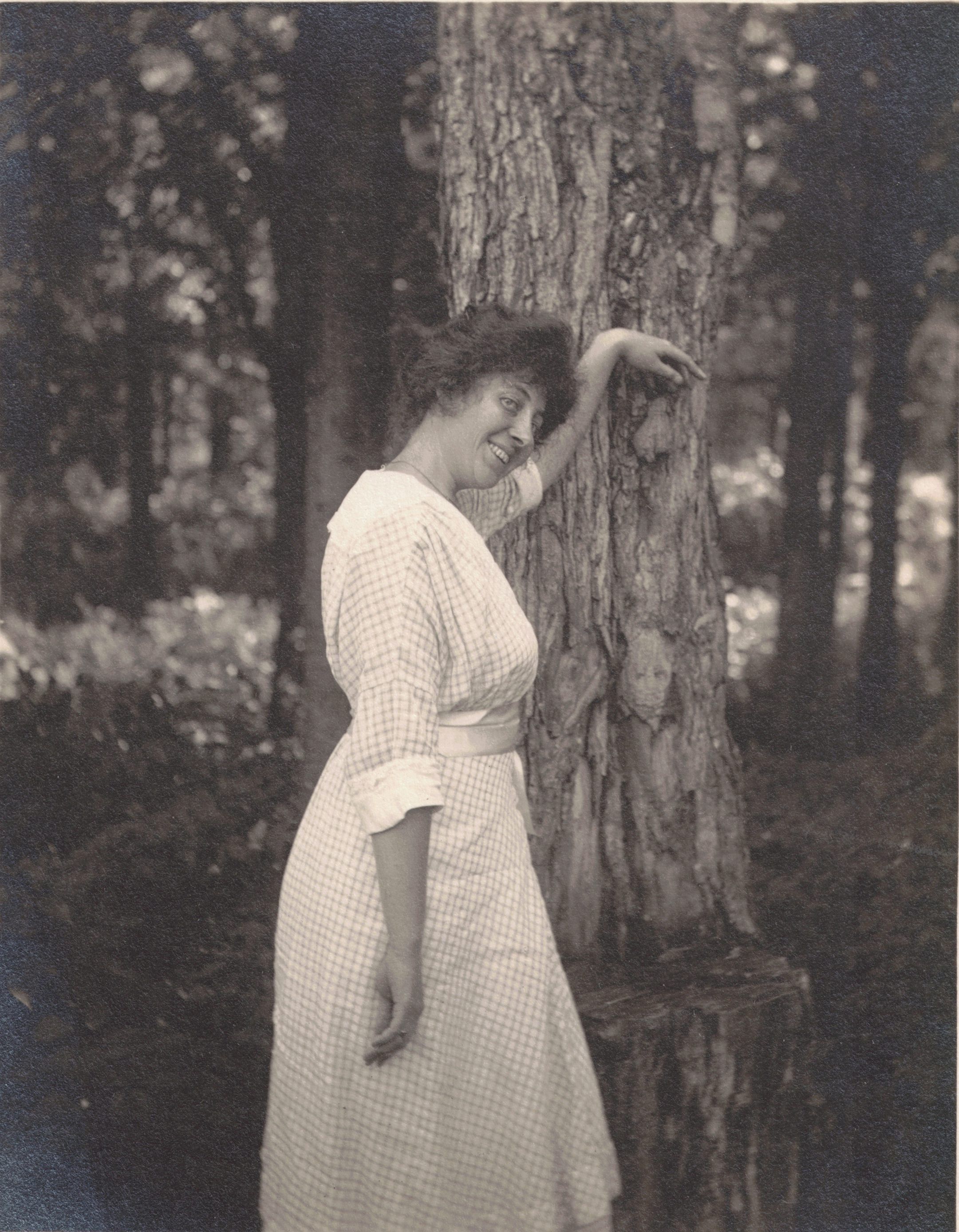 Photograph of Tarsilla Schuster leaning with one arm against a tree.