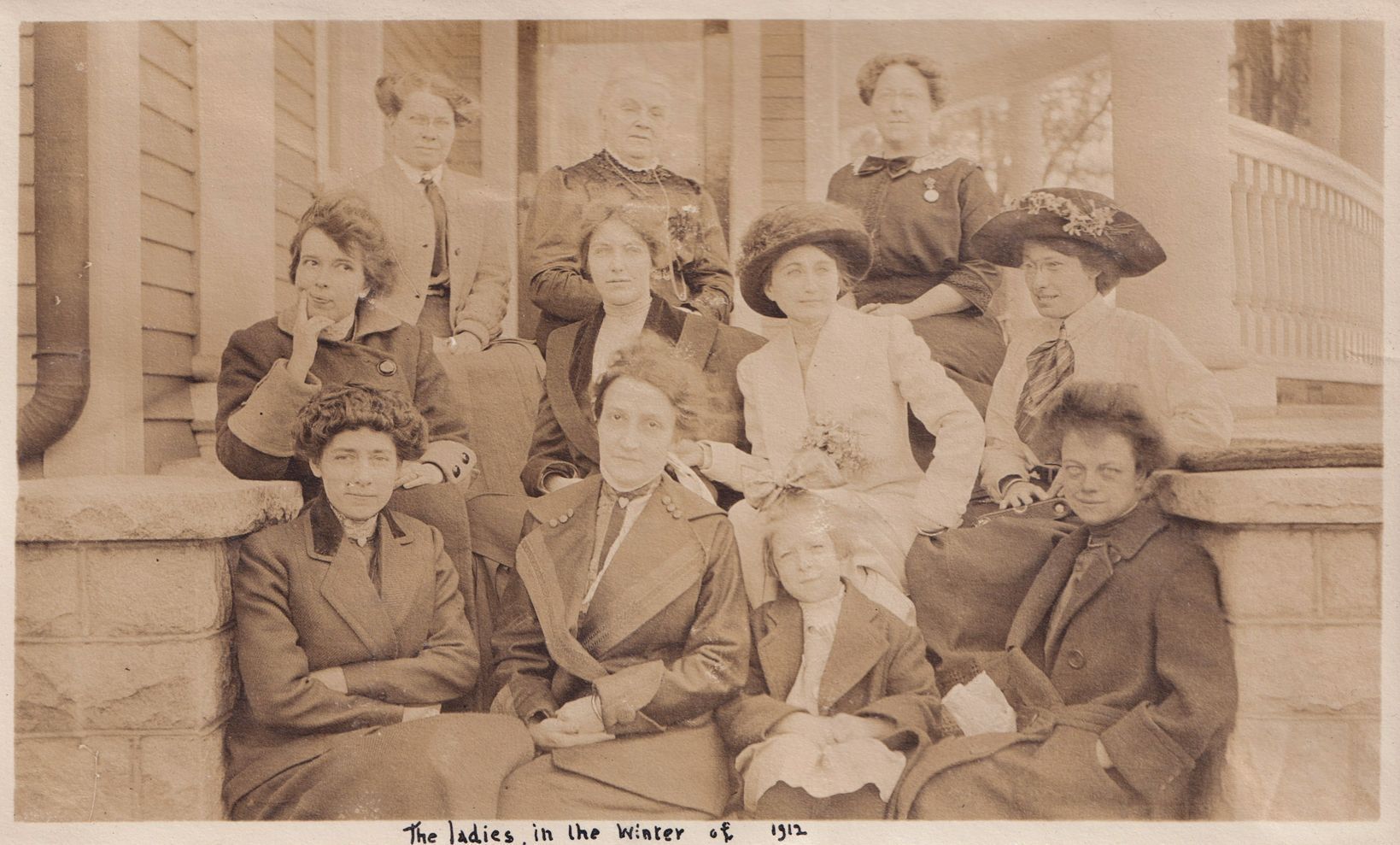 Black-and-white photograph of ten women and one girl sitting together on the front steps of a house. "The ladies in the Winter of 1912" is written in ink beneath the photograph.