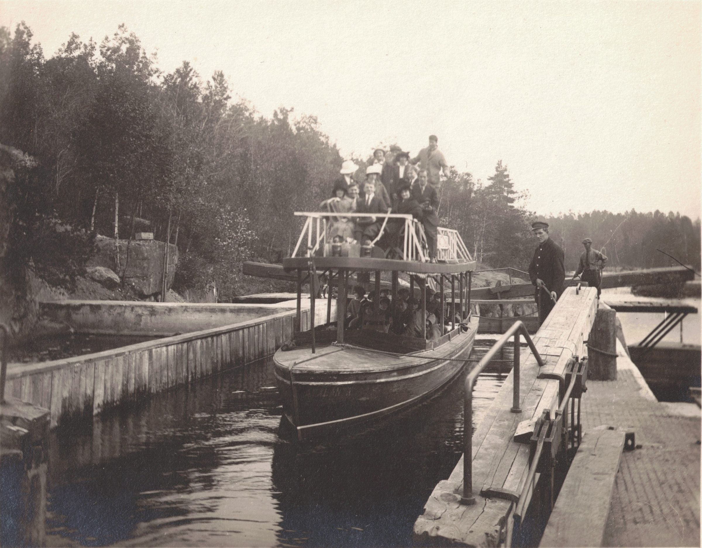 Photograph of a double decker wooden tourist boat passing through a boat lock, possibly the lower locks between Lower Saranac and Kiwassa. There are people on both levels of the boat, and two men standing to the side operating the locks. The name of the boat is difficult to read, but may be "Atalanta." William Schuster is likely seated at the front of the boat, although the photo is slightly blurry.Photograph Details