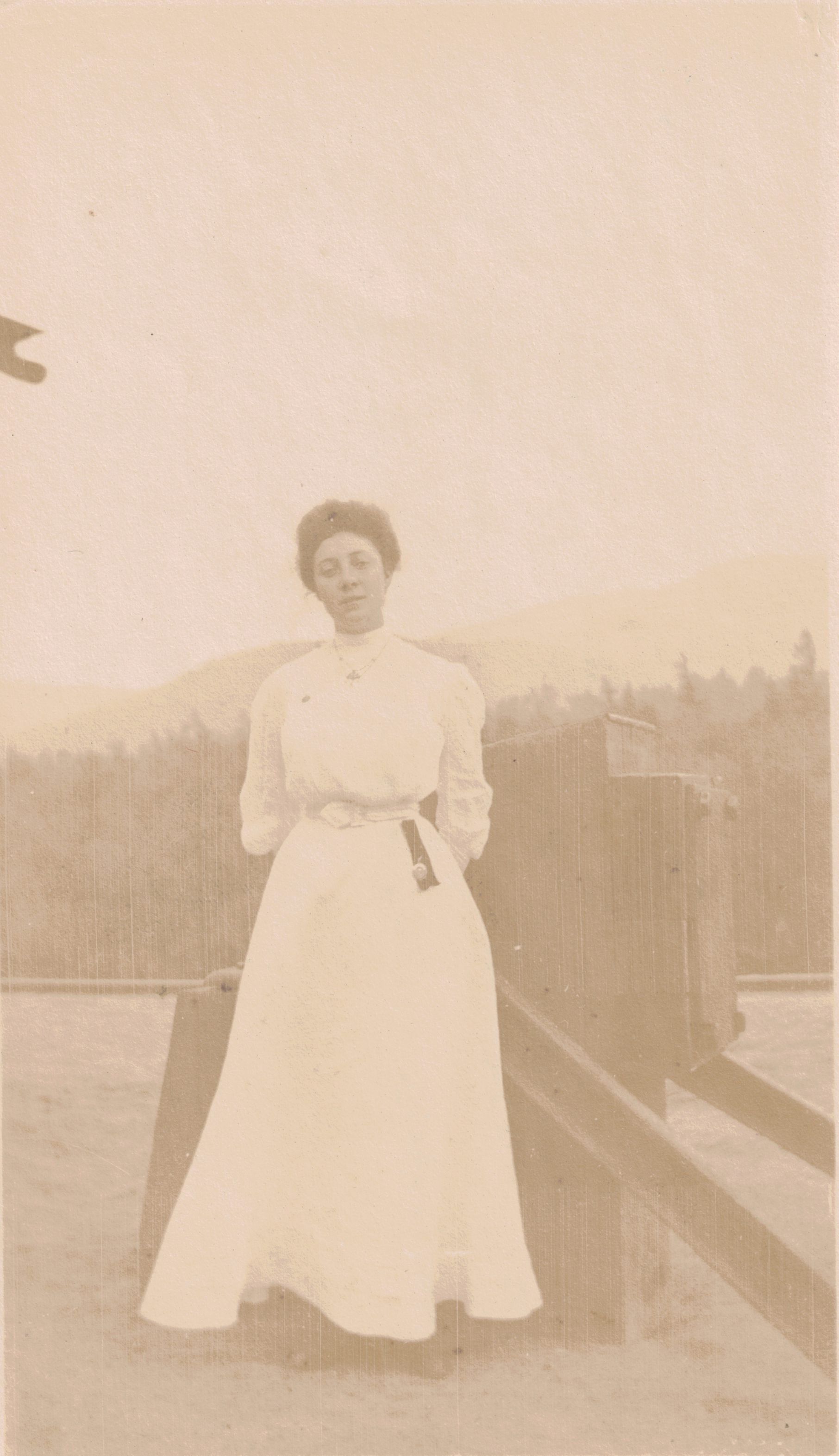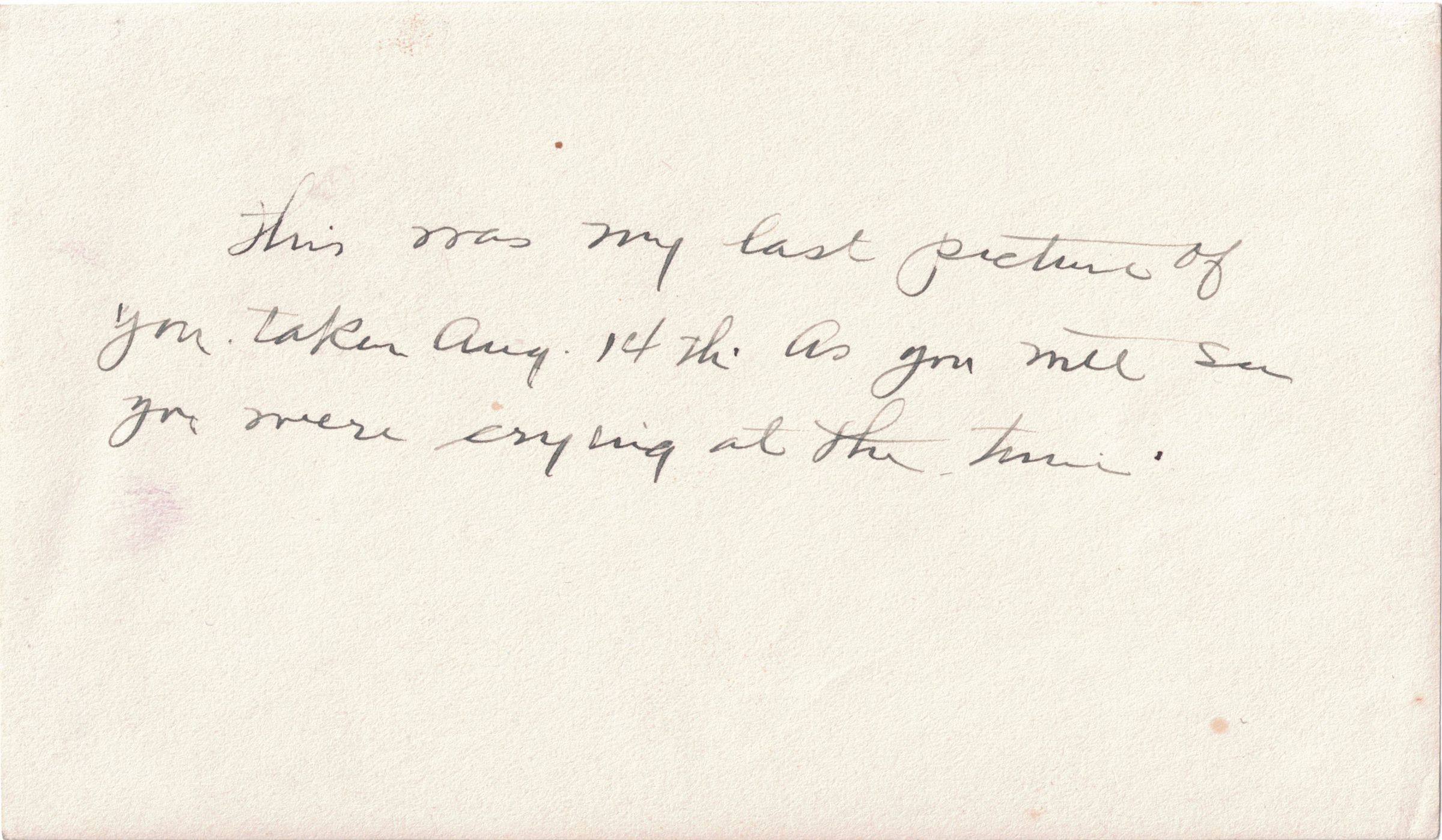 Photograph of Tarsilla Schuster standing outdoors and looking directly at the camera. Caption on reverse reads, "This was my last picture of you. Taken Aug. 14th. As you will see you were crying at the time."