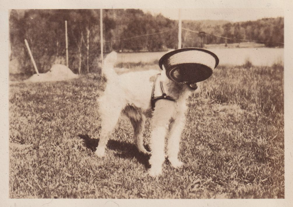 Black-and-White photograph of the Jones' dog Peggy begging. She is holding her food dish up in the air in her mouth.