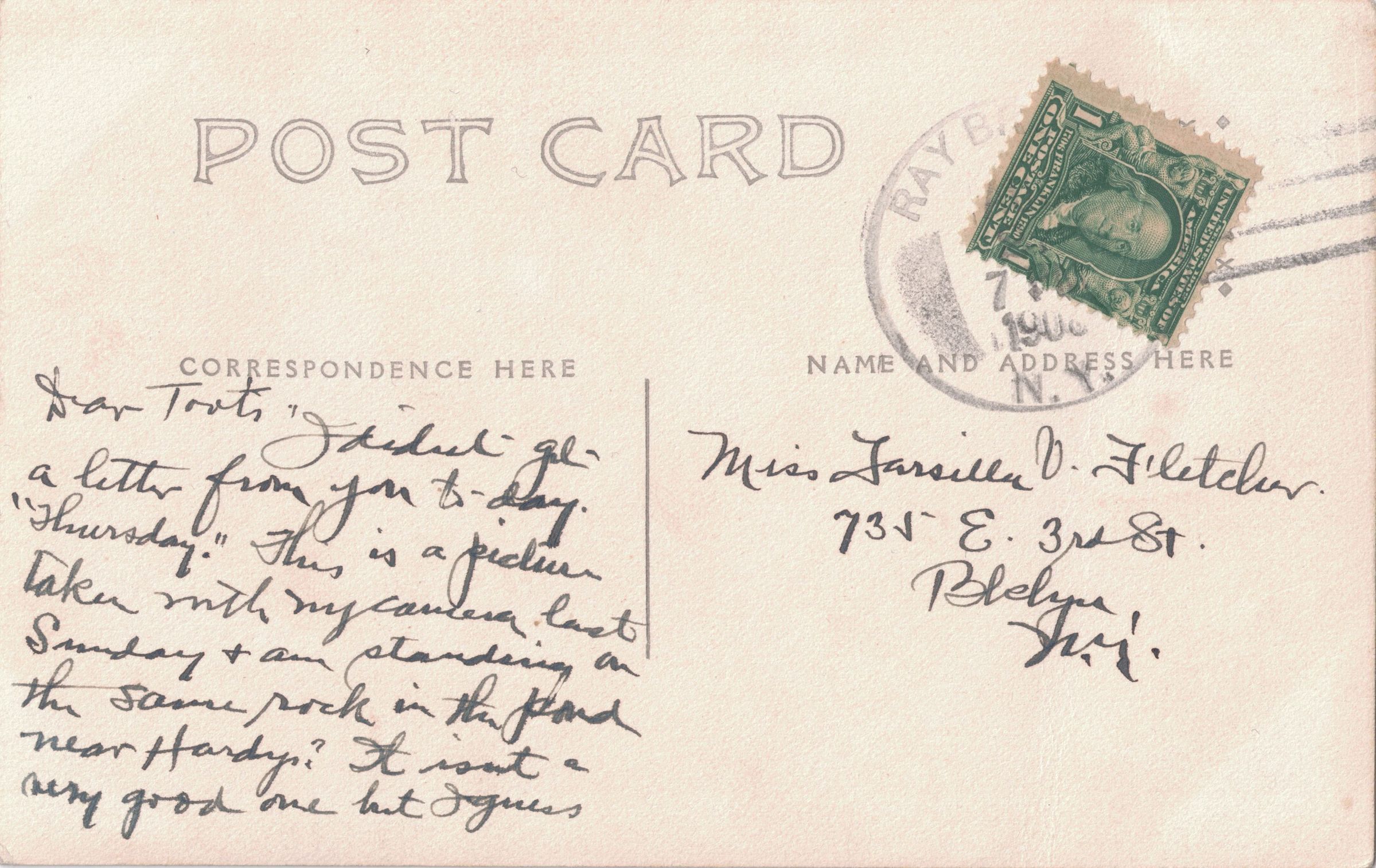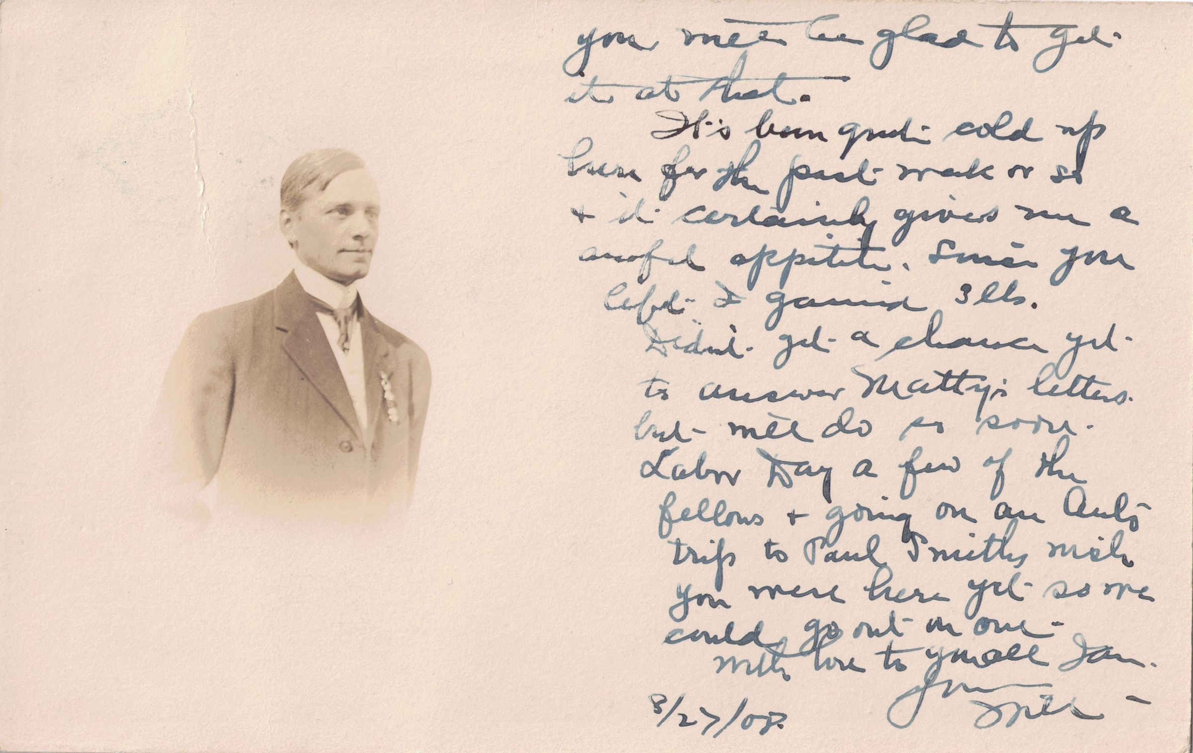 Photograph of William Schuster with postcard backing, sent by William to his wife Tarsilla Schuster. Postcard reads, "Dear Toots, I didn't get a letter from you today. "Thursday." This is a picture taken with my camera last Sunday and am standing on the same rock in the pond near Hardy? It isn't a very good one but I guess you will be glad to get it at that. It's been quite cold up here for the past week or so and it certainly gives me an awful appetite. Since you left I gained 3 lbs. Didn't get a chance yet to answer Matty's letters but will do so soon. Labor Day a few of the fellows and going on an auto trip to Paul Smith's. Wish you were here yet so we could go out more. With love to you all [?], W Schuster 8/27/08." Addressed to "Mis Tarsilla V. Fletcher, 735 E. 3rd St. Bklyn, NY."Photograph Details