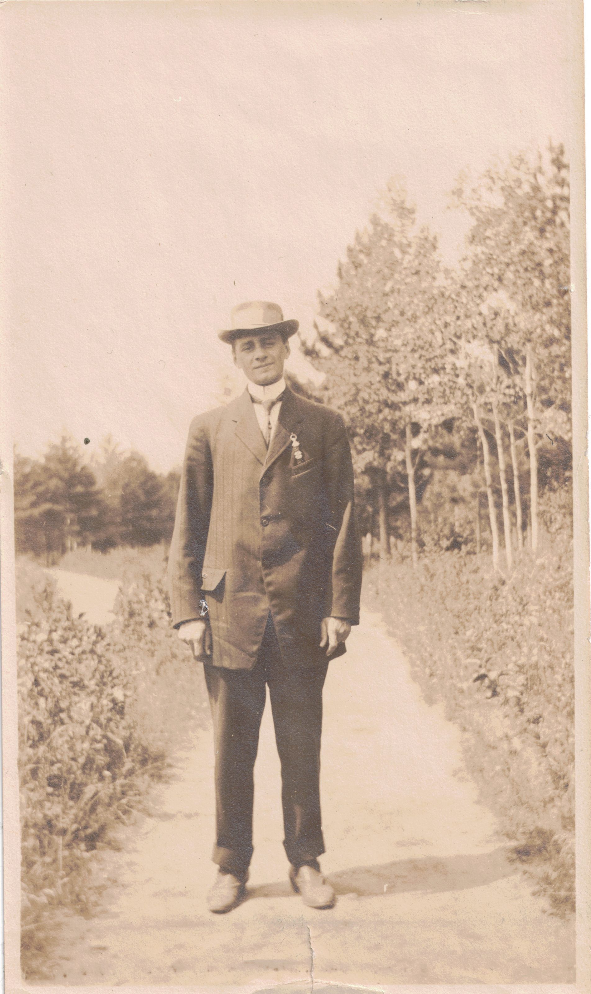 Photograph of William Schuster in a suit and hat, standing on a pathway outdoors.