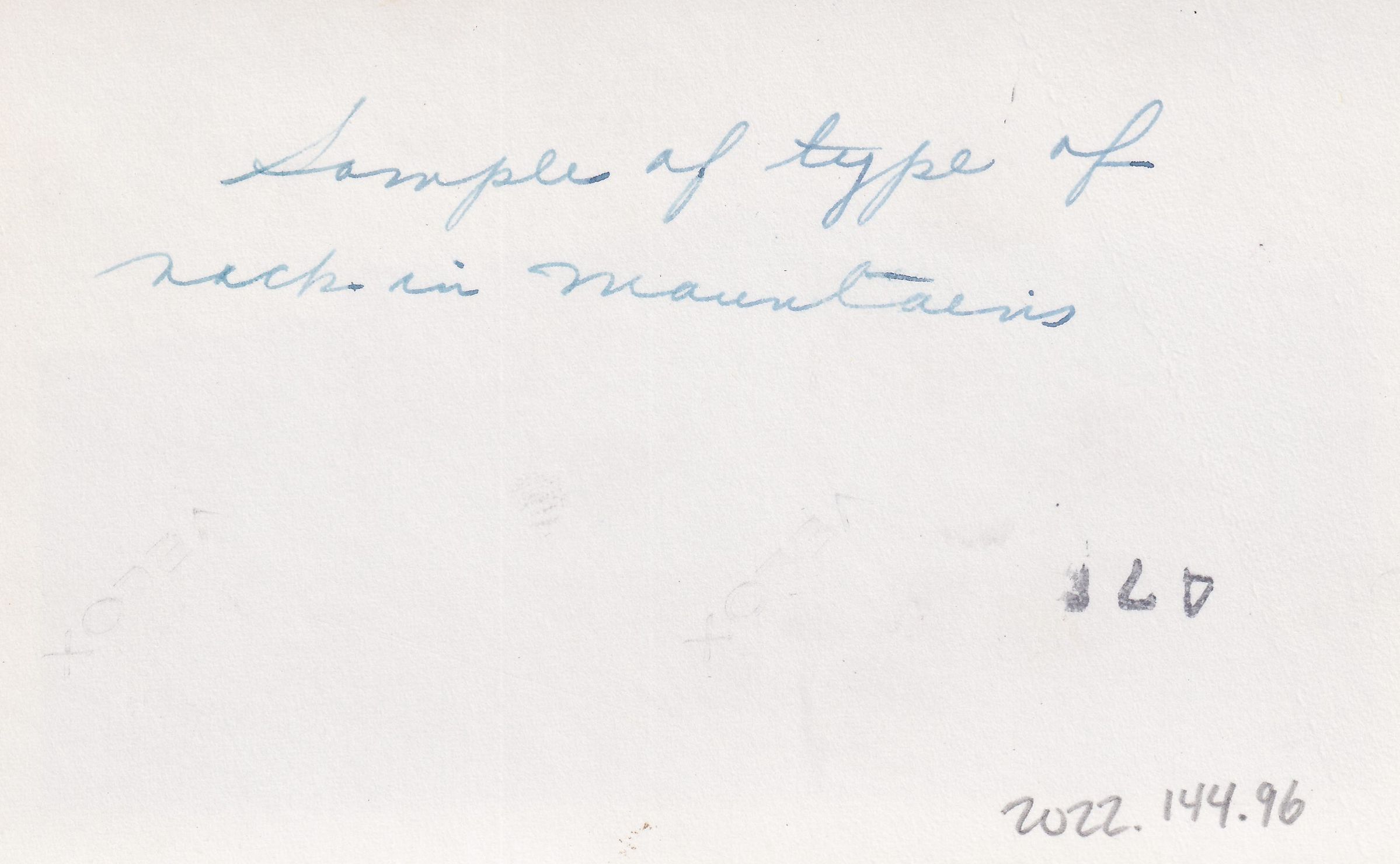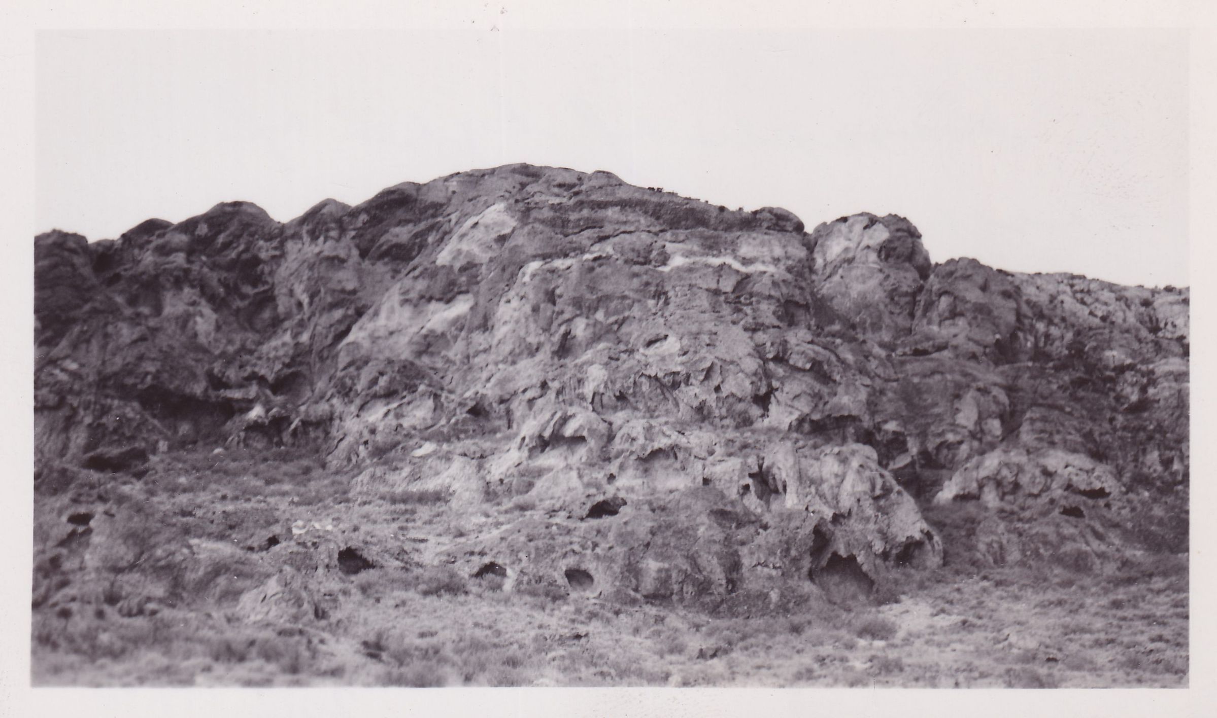 Black-and-White photograph of a rocky mountain outcropping. Handwritten caption on back reads, "Sample of type of rock in mountains."