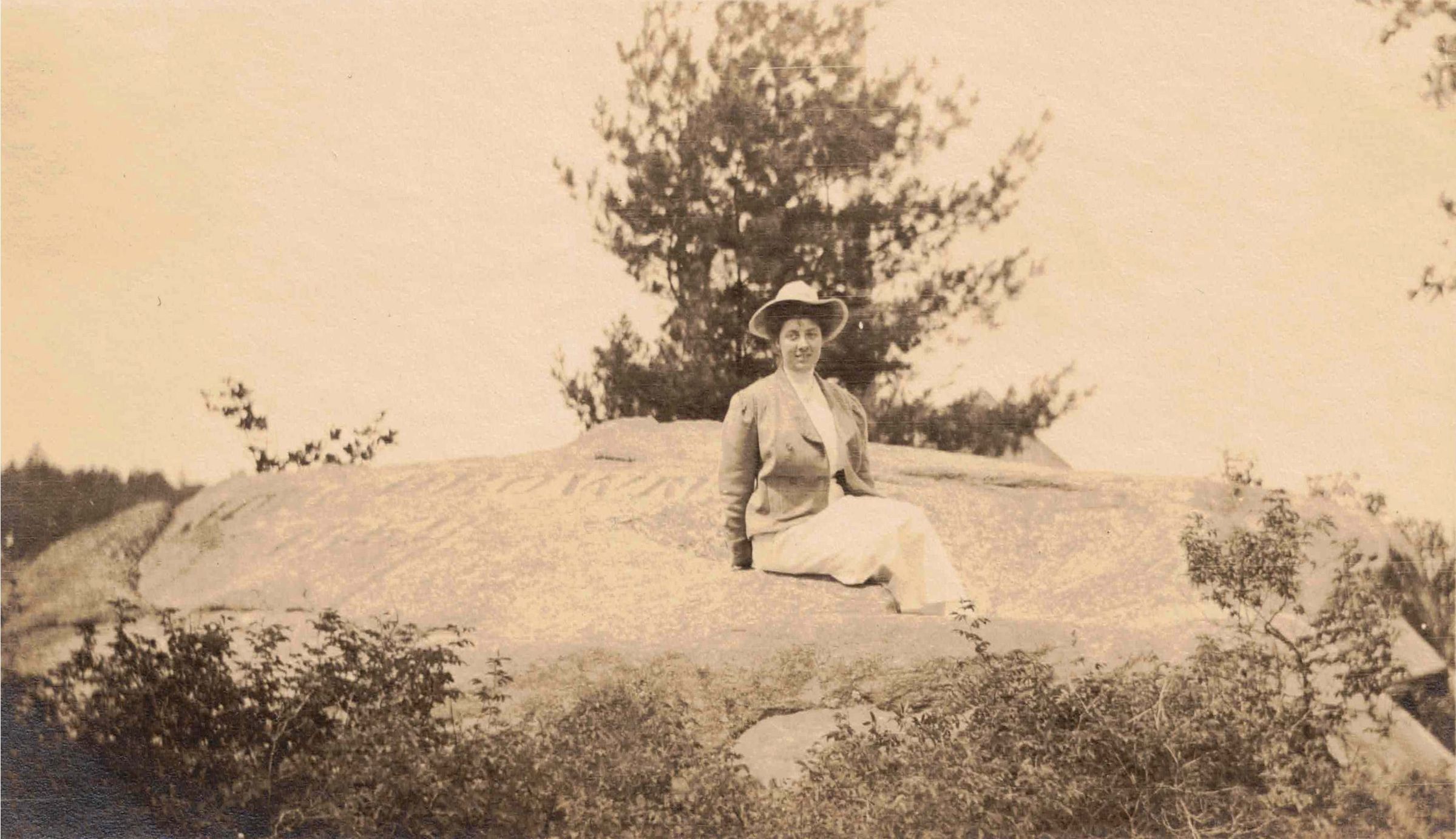 Photograph of Tarsilla Schuster sitting on a large rock with a tree in the background.