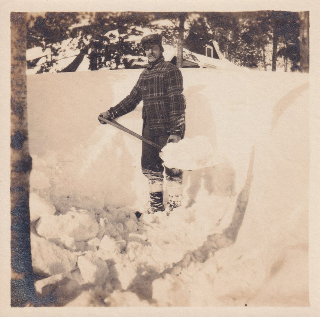 Black-and-White photograph of a man holding a shovelful of snow. There is a large snowbank behind him; the snow comes up to his shoulders. The photograph was likely printed by Kollecker's Kodak and Gift Shop.
