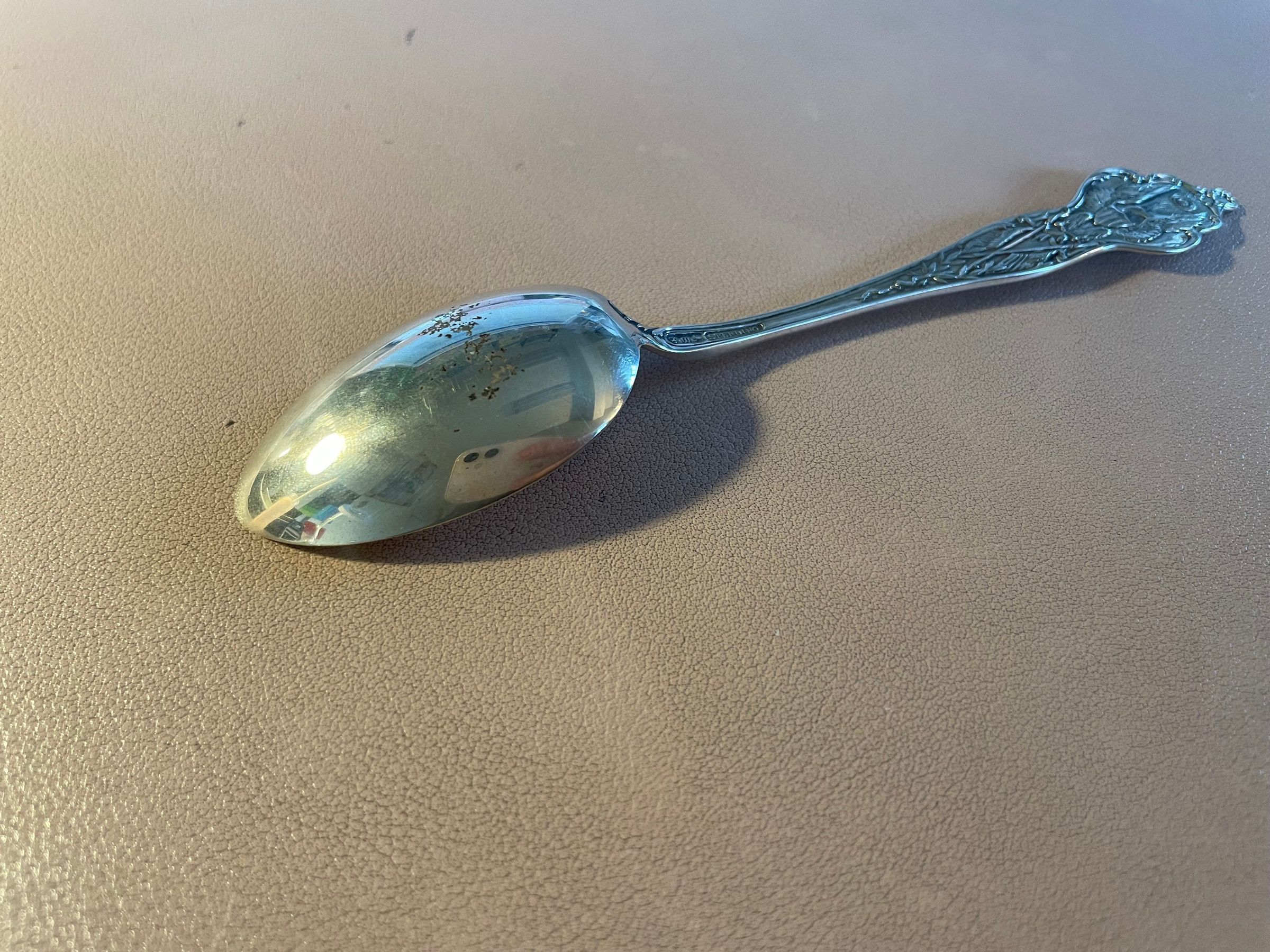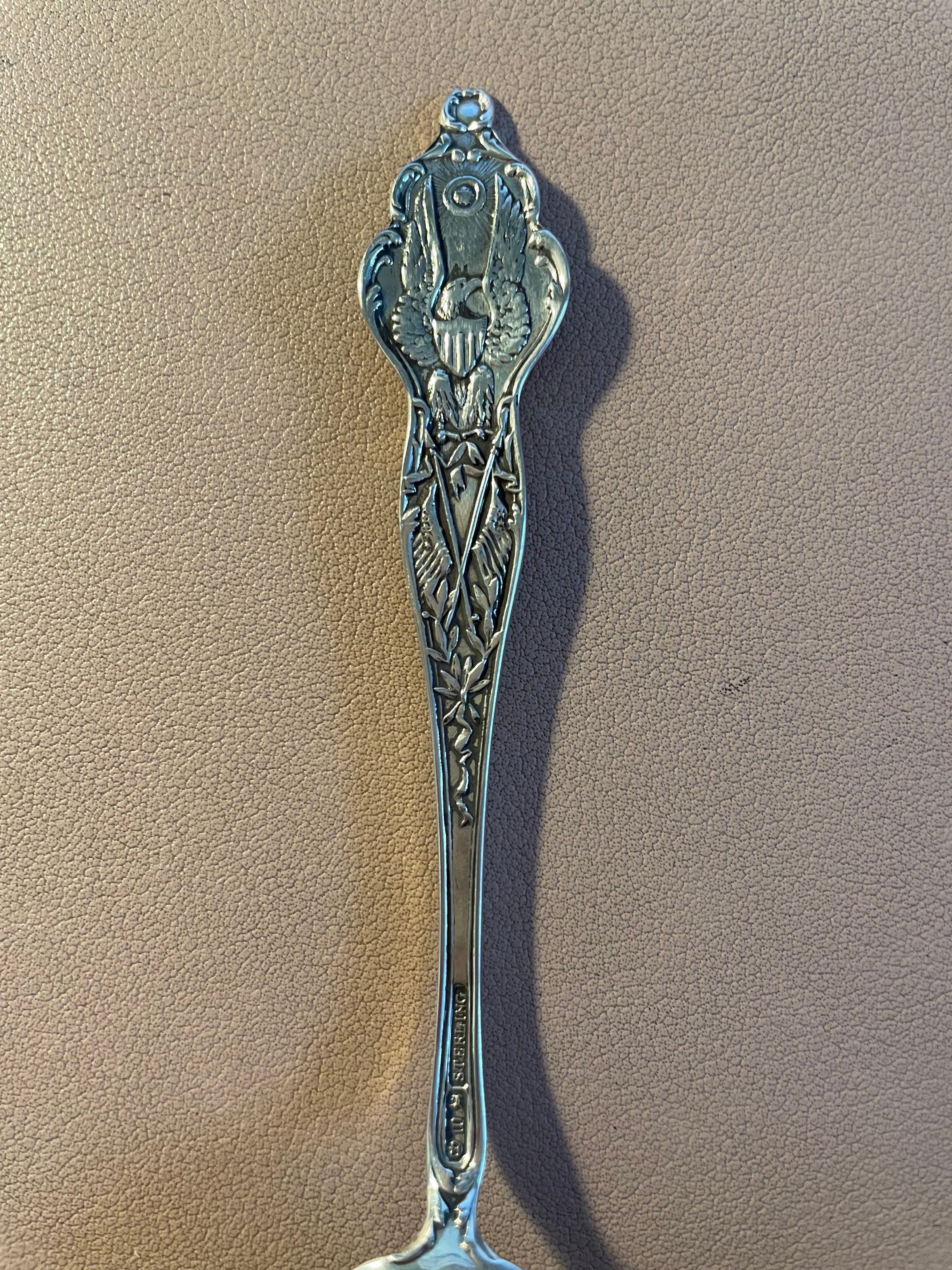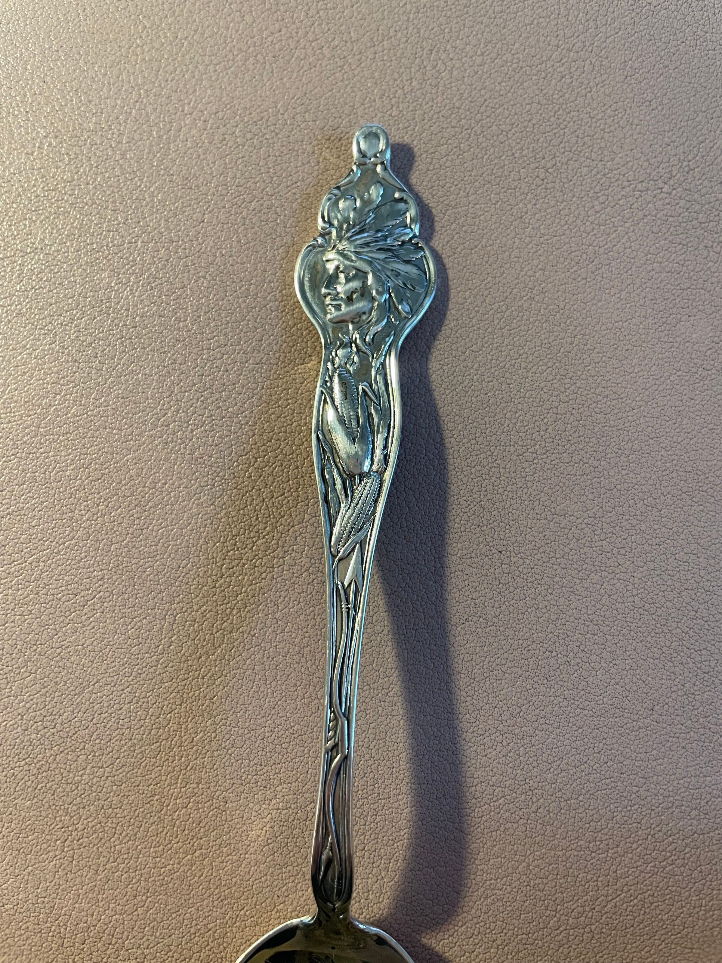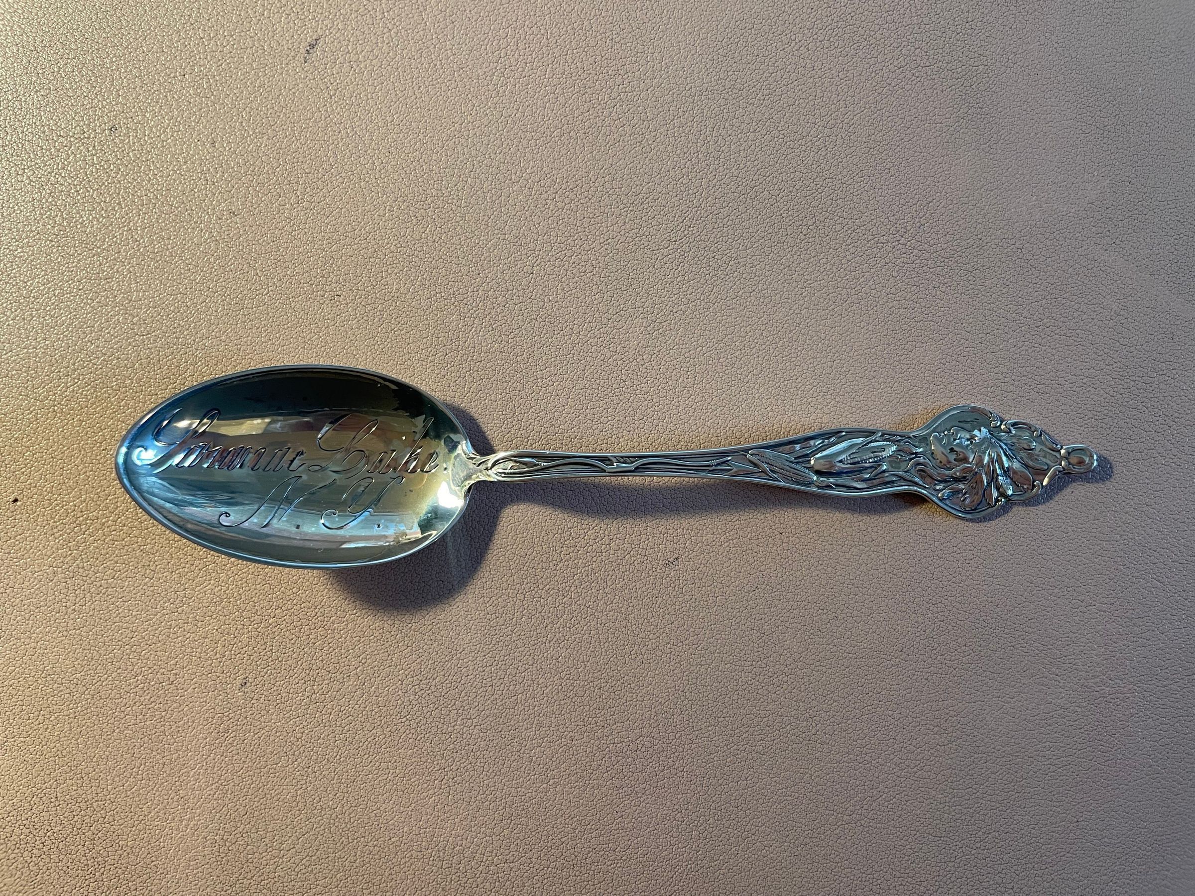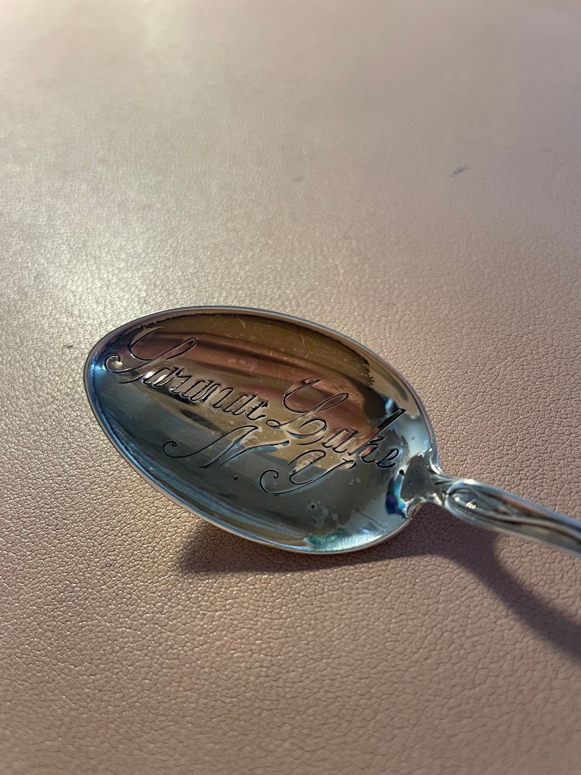 Sterling silver souvenir spoon with "Saranac Lake, N.Y." engraved in the bowl. Handle has a bow and arrow, corn stalks, and a Native American in a feathered headdress on the front. Reverse of handle has a sun, eagle with shield, and crossed American flags, and is stamped, "Sterling."Collection