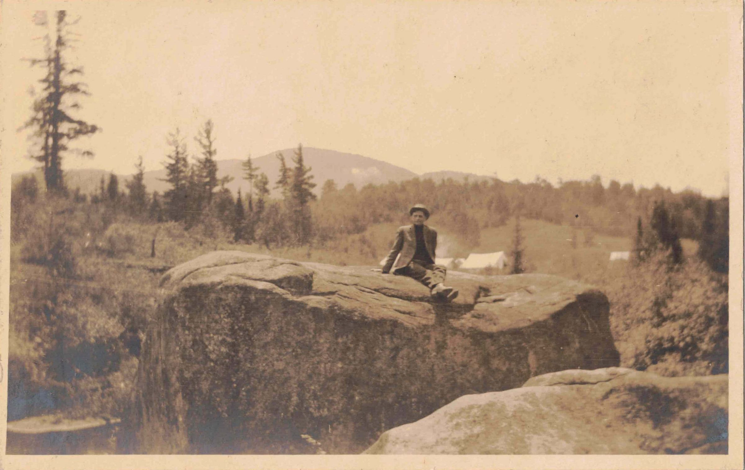 Photograph of William Schuster sitting on a large rock with trees and mountains in the background. A group of tents can be seen behind William, and Scarface Mountain is visible in the background at center. Printed on blank postcard backing.Photograph Details