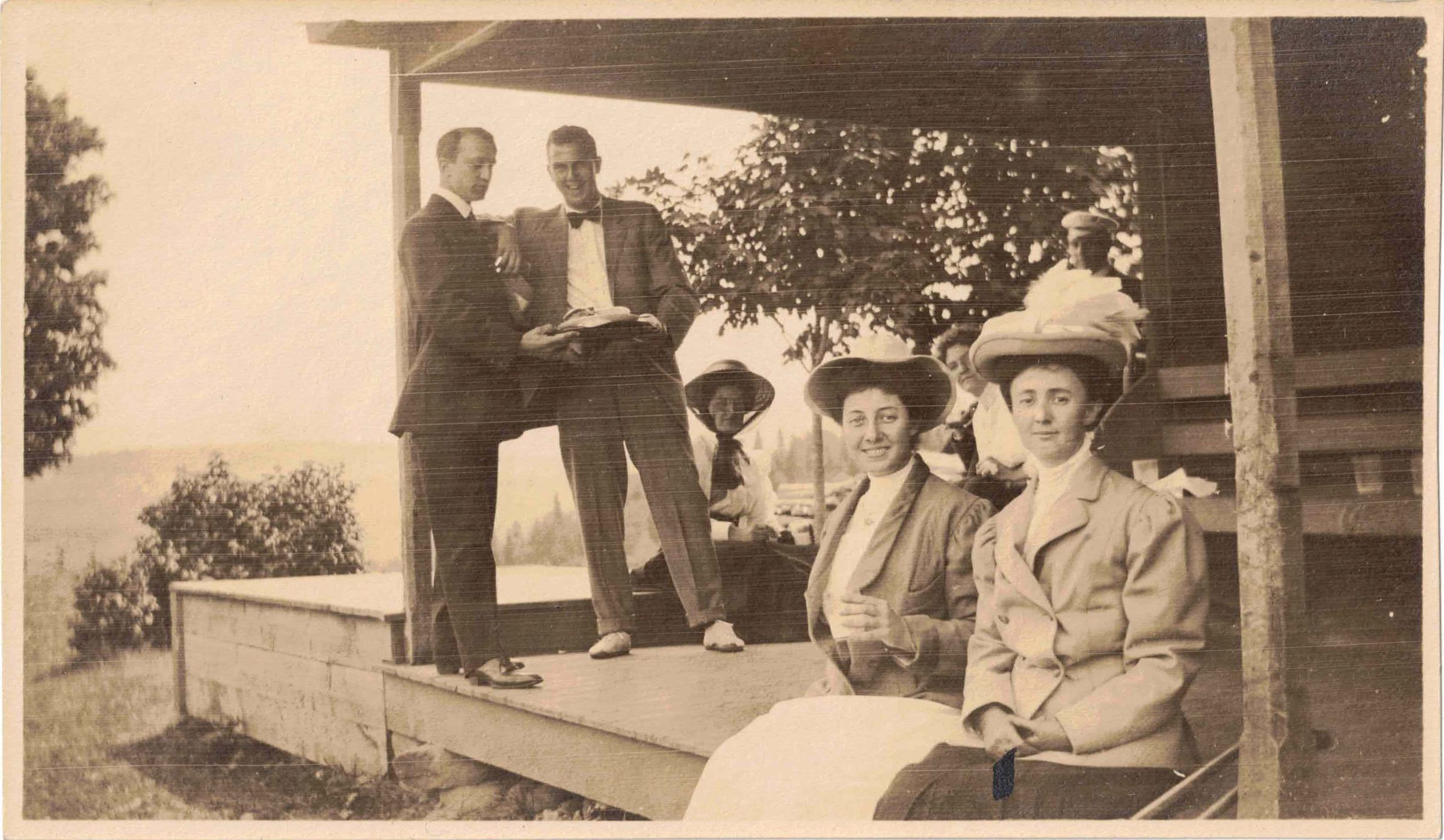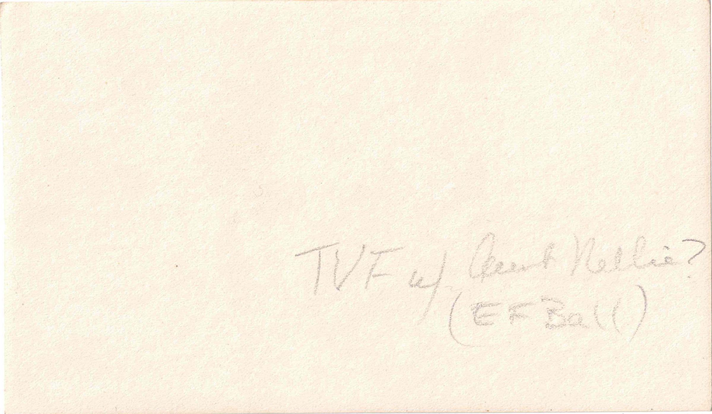 Photograph of Tarsilla Schuster and a woman identified on the back as "Aunt Nellie" sitting on a porch; Tarsilla holds a drink in her hand. Two men and two other women are in the background, all unidentified. Caption on reverse reads, "TVF w/Aunt Nellie? (EF Ball)."Photograph Details