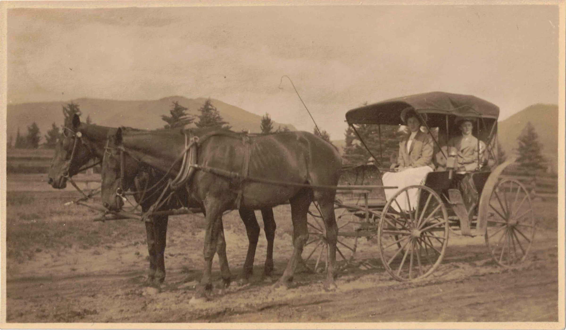 Photograph of Tarsilla Schuster sitting in the front seat of a carriage drawn by two horses. Another unidentified person sits in the back seat.