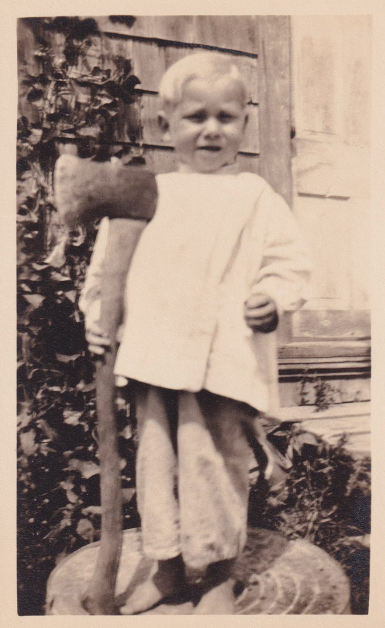 Black-and-White photograph of a small child holding an axe outdoors. The photograph was likely printed by Kollecker's Kodak and Gift Shop.