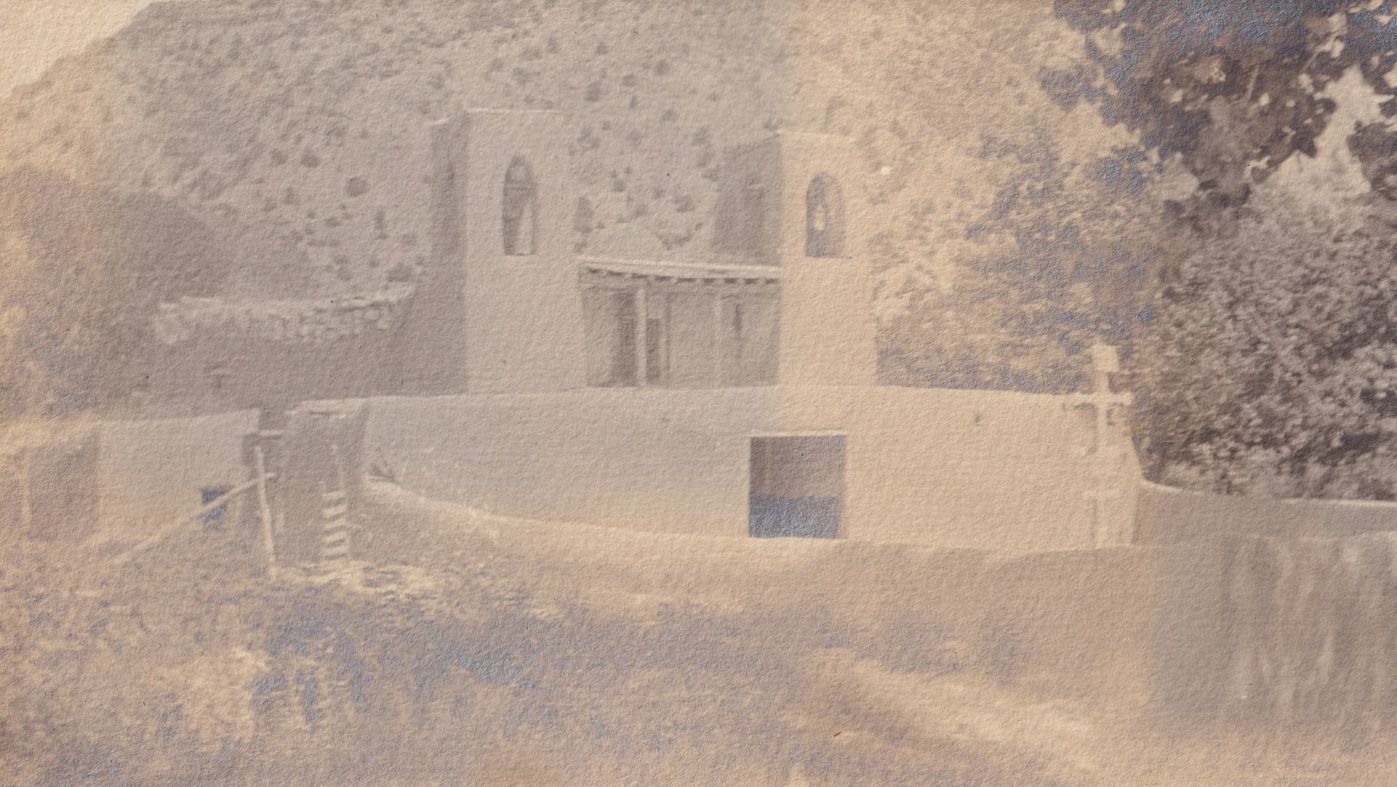 Black-and-white photograph of an adobe building. The building has two taller towers that stand above the rest of the building and have windows in all four sides.