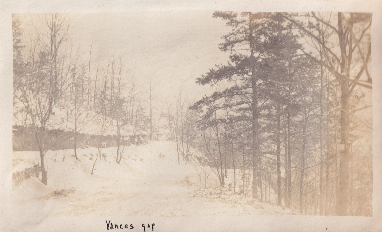 Black-and-white photograph of a snow covered landscape with a path leading between a wooded area down an incline, and another incline going higher with a stone wall. "Vances gap" is written in ink beneath the photograph.