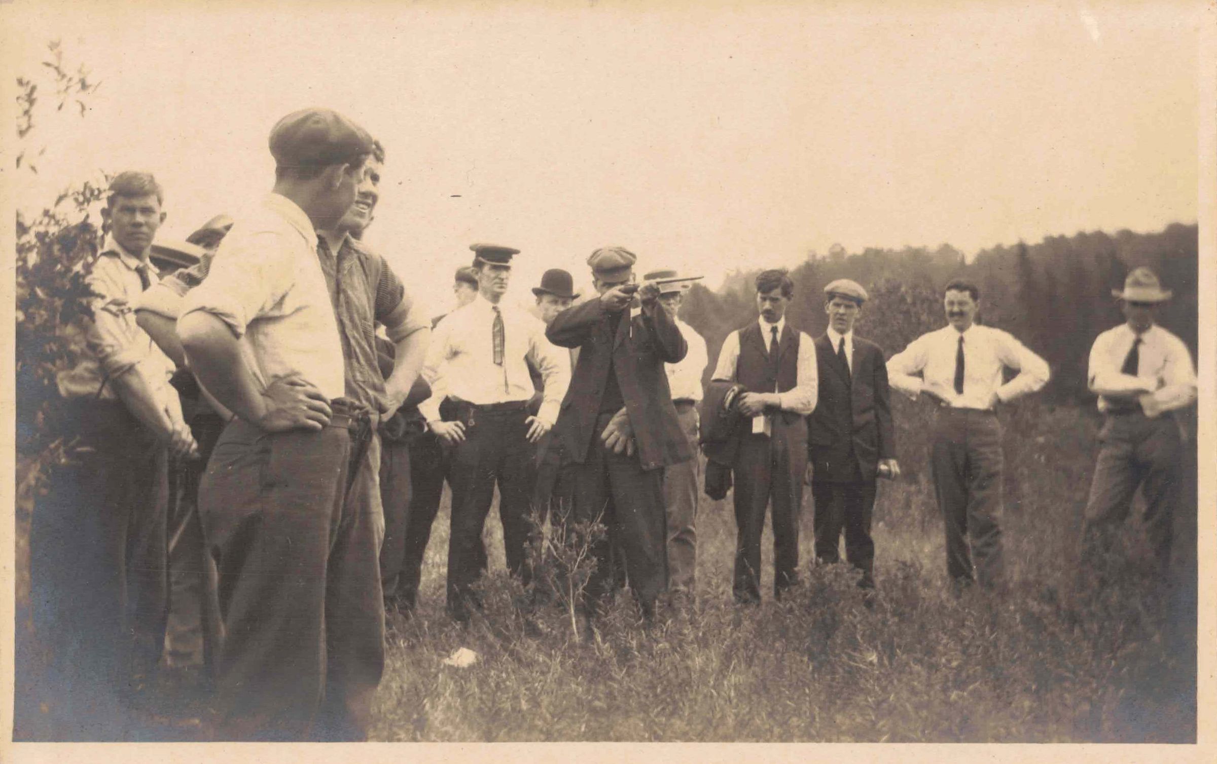 Photograph of a group of unidentified men. The man at center is pointing a rifle to the right. Printed on blank postcard backing.