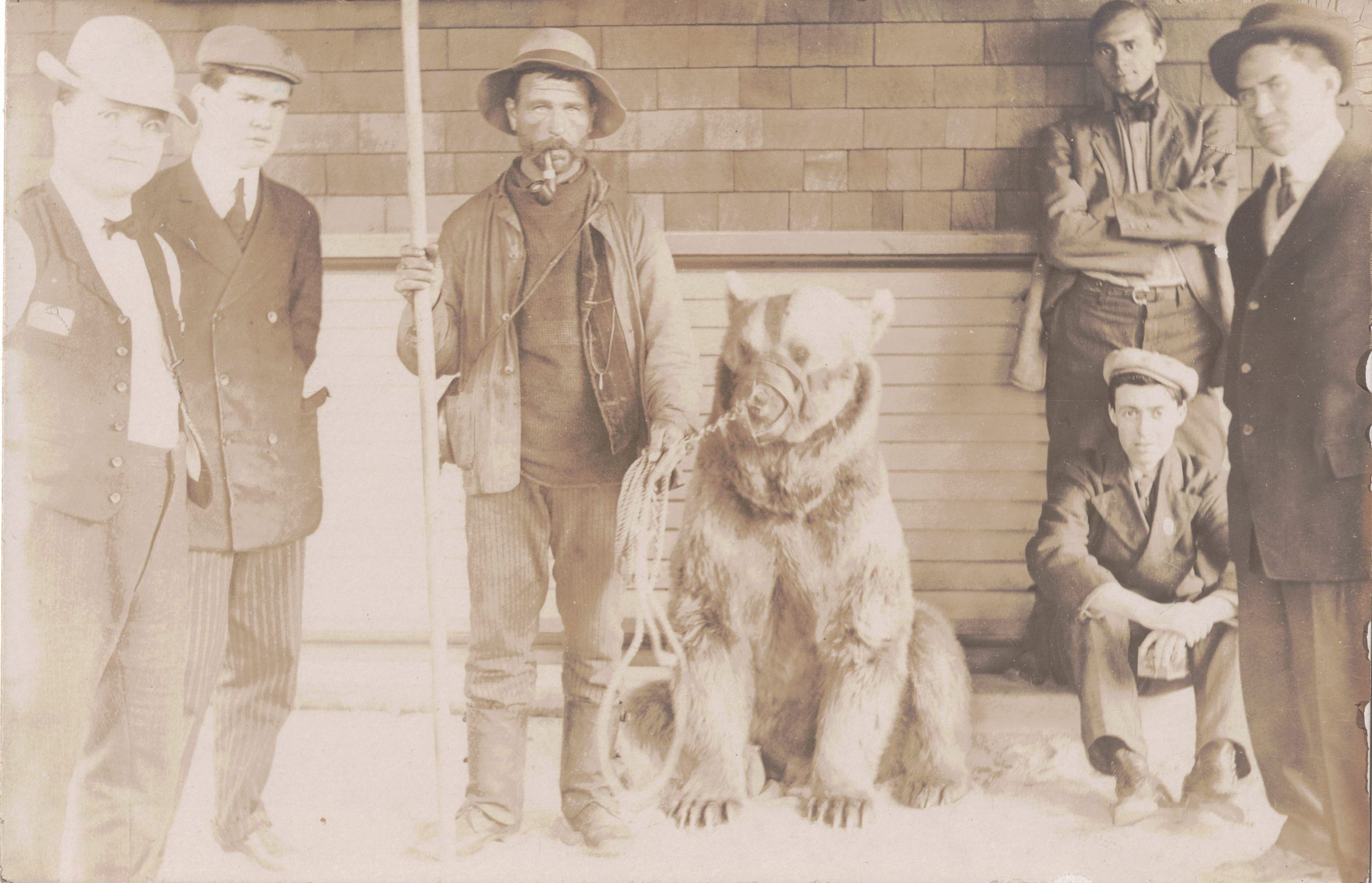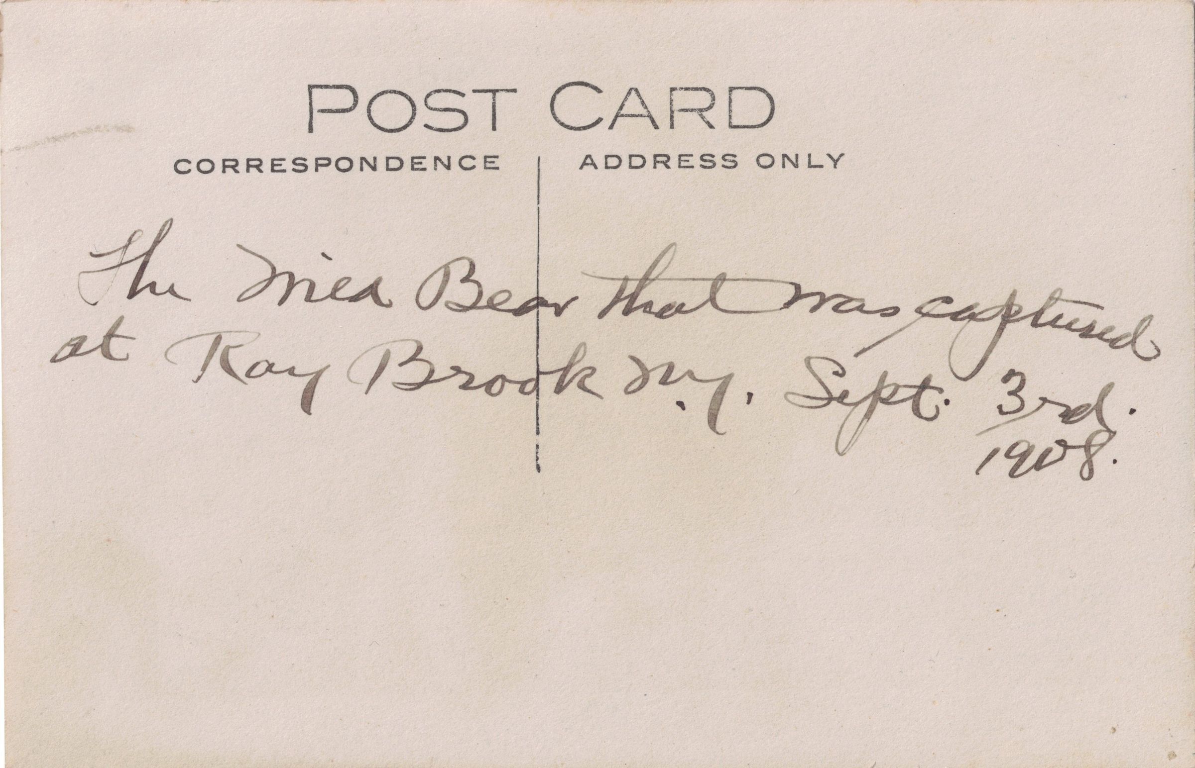Photograph of William Schuster, standing second from right, and a group of unidentified men with a bear on a chain. Caption on postcard backing reads, "The wild bear that was captured at Ray Brook NY Sept. 3rd 1908."Photograph Details