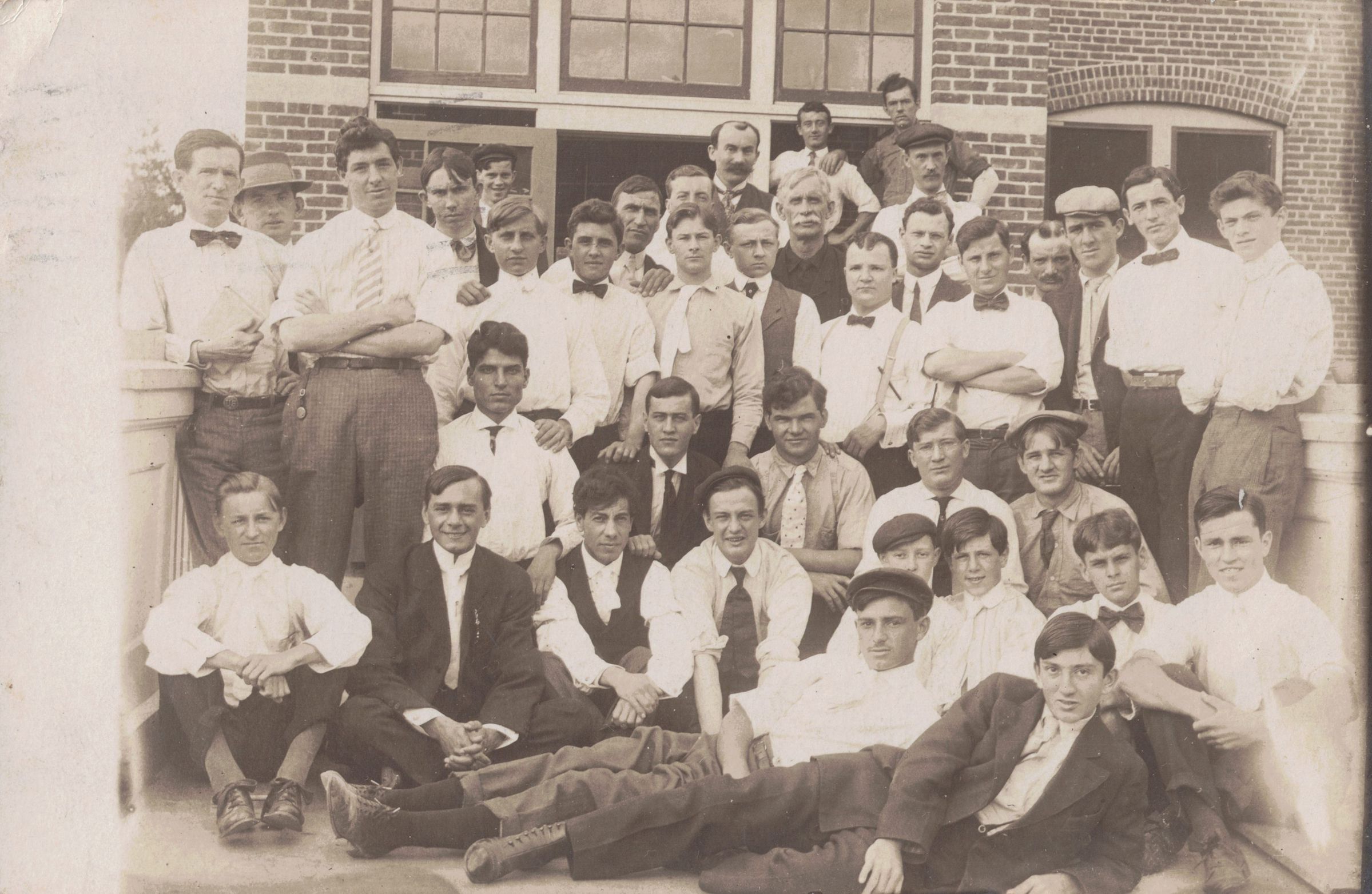 Photograph of a group of men and boys outside of the Main Building at the New York State Hospital for Incipient Tuberculosis, AKA Ray Brook Sanatorium. The only identified individual is William Schuster, seated second from left in a dark coat.