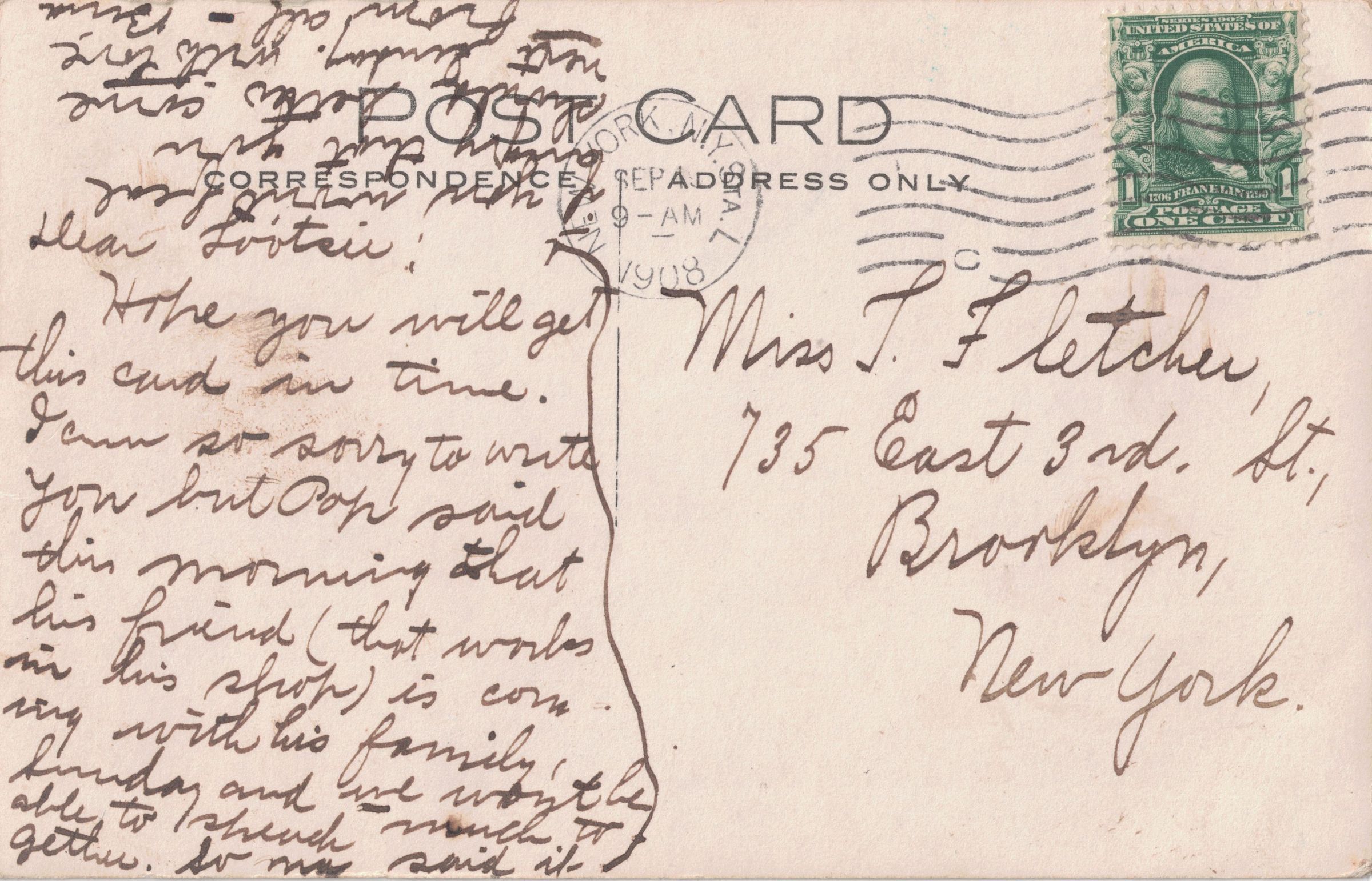 Message on postcard backing reads, "Dear Tootsie, Hope you will get this card in time. I am so sorry to write you but Pop said this morning that his friend (that works in his shop) is coming with his family Sunday and we won't be able to (?) much together. So we said if you won't feel angry that you should better come next Sunday. With love from all, Bill." It is addressed to "Miss T. Fletcher, 735 East 3rd St, Brooklyn, New York."Photograph Details
