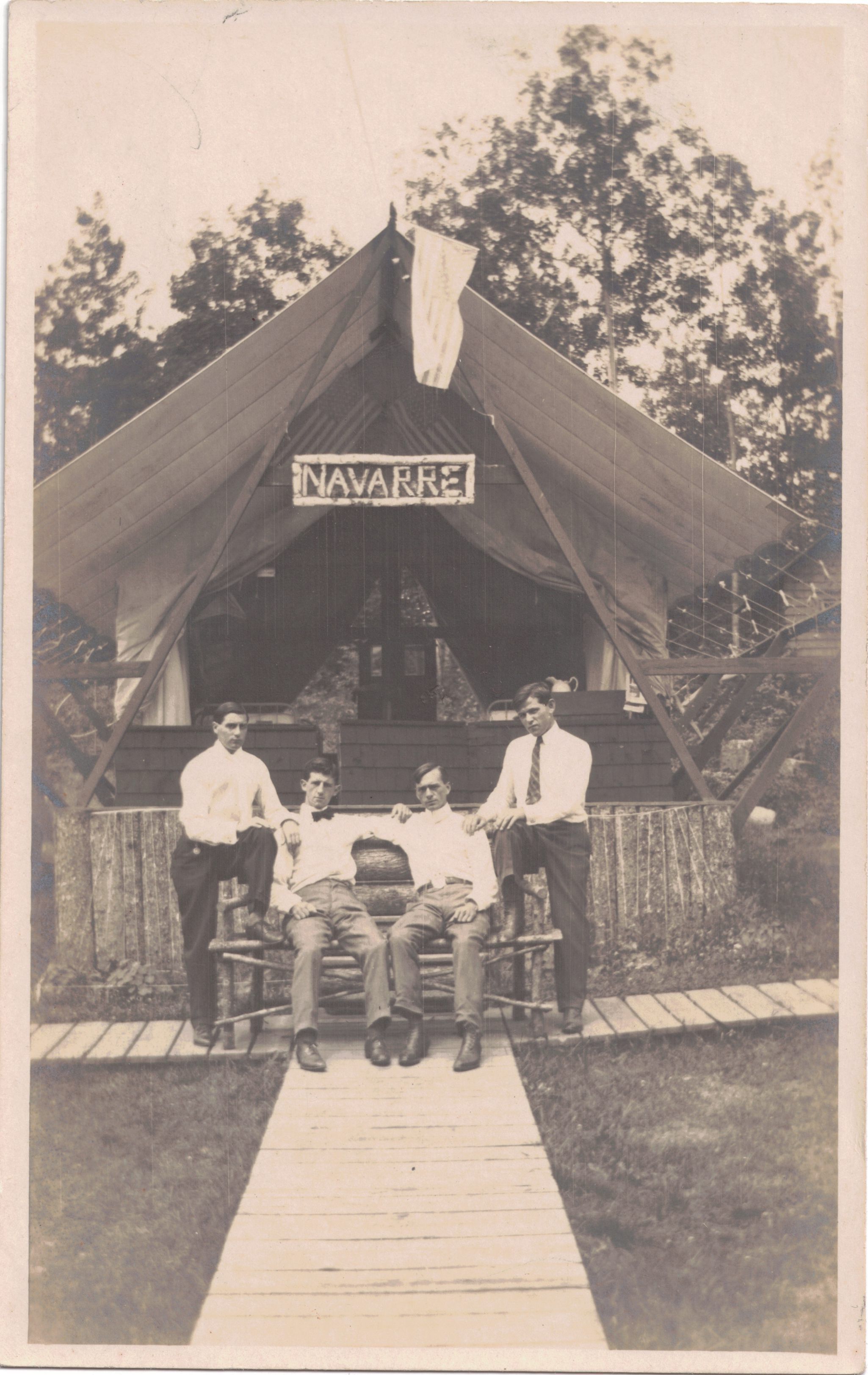 Photograph of William Schuster (second from right) and three unidentified men in front of the Navarre tent platform at the New York State Hospital for Incipient Tuberculosis, AKA Ray Brook Sanatorium. William is seated on a bench with another man and the other two stand to either side. Printed on blank postcard backing.Photograph Details