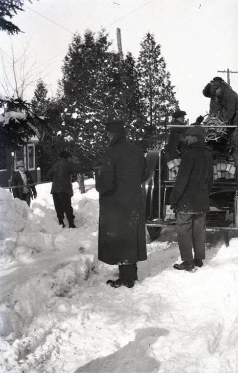 Negative of a group of unidentified people standing around or inside a car parked outside a house on a snow-covered road. Most likely taken by Mary Ives Baldwin. This item is not fully cataloged but has been uploaded so the image is publicly available; if you would like us to prioritize cataloging this item, please contact the HSL Collections team.