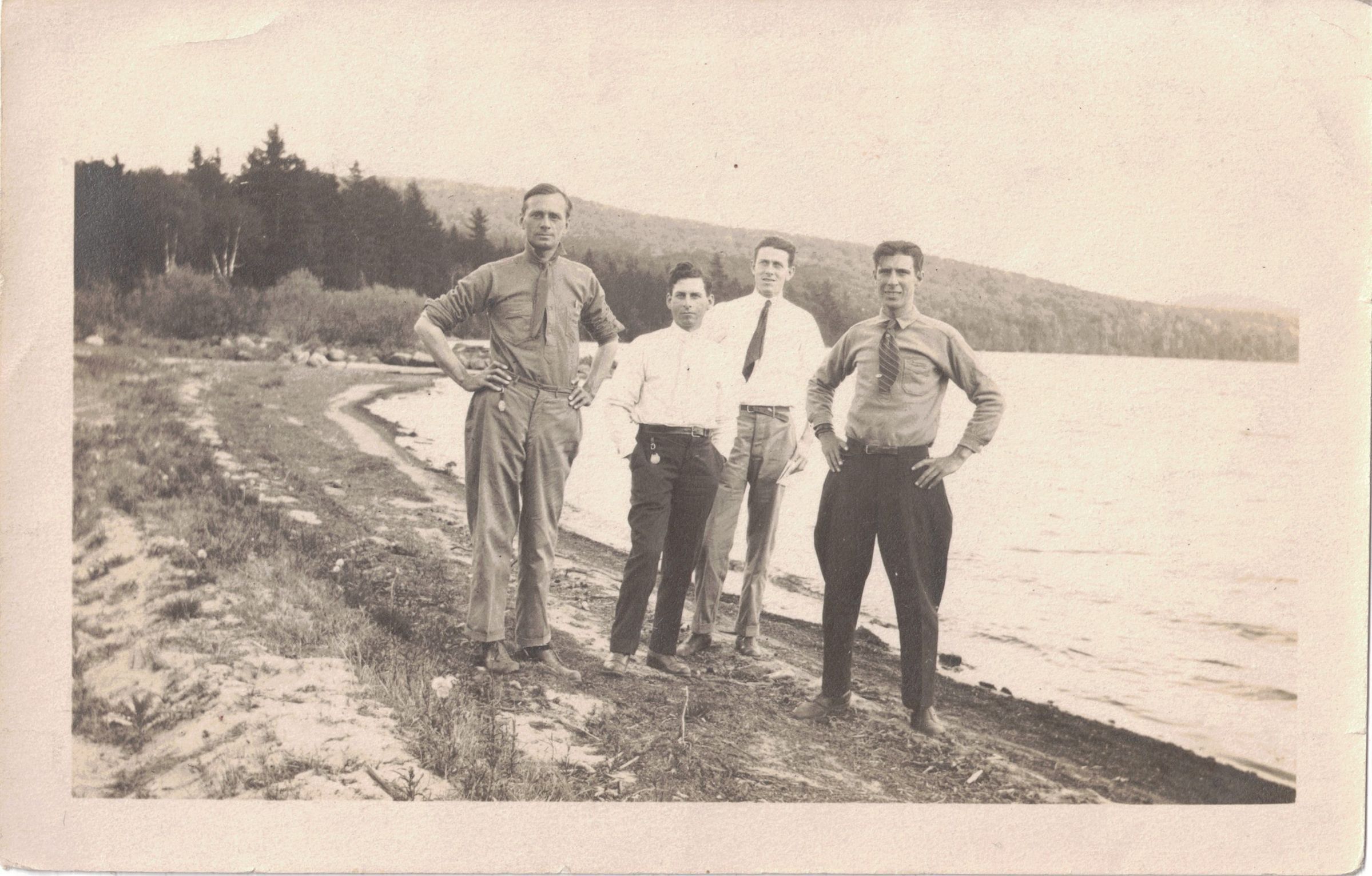 Photograph of William Schuster, far left, and three unidentified men on a beach along a lake. Caption on reverse reads, "Taken at Meacham Lake, N.Y. June 7, 1915."Photograph Details