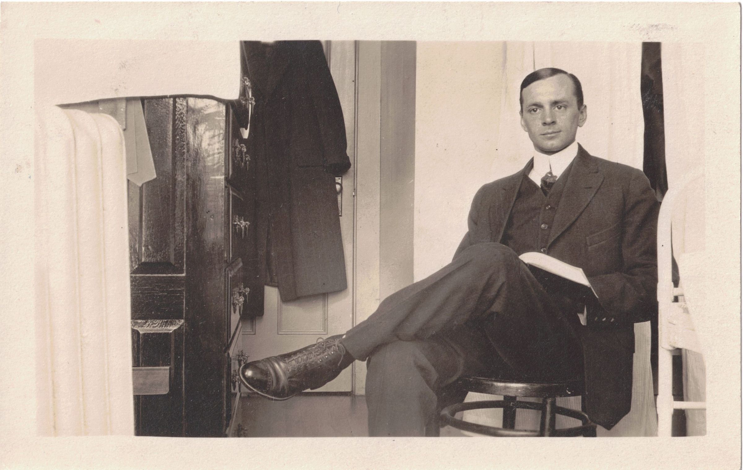 Photograph of William Schuster sitting in a chair, presumably in his room at Ray Brook, with his legs crossed and a book on his lap. Caption on reverse reads, "Nov 25, 15. Wt. 130 lbs. For Mamma." An identical photo with the same caption reads, "For Toots."Photograph Details