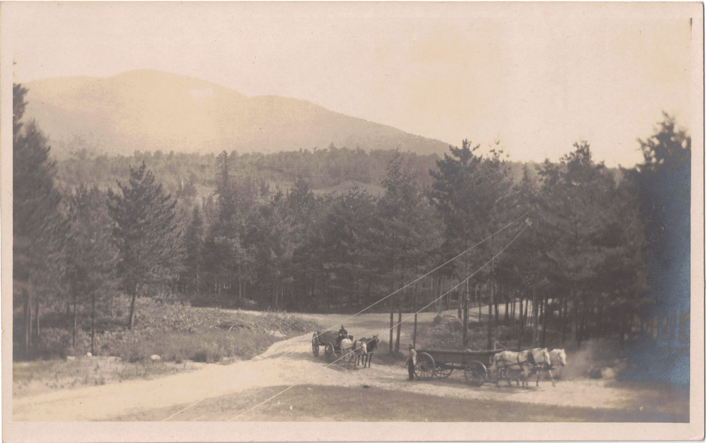 Photograph of a landscape with horses and carriages in the foreground. Printed on blank postcard backing.