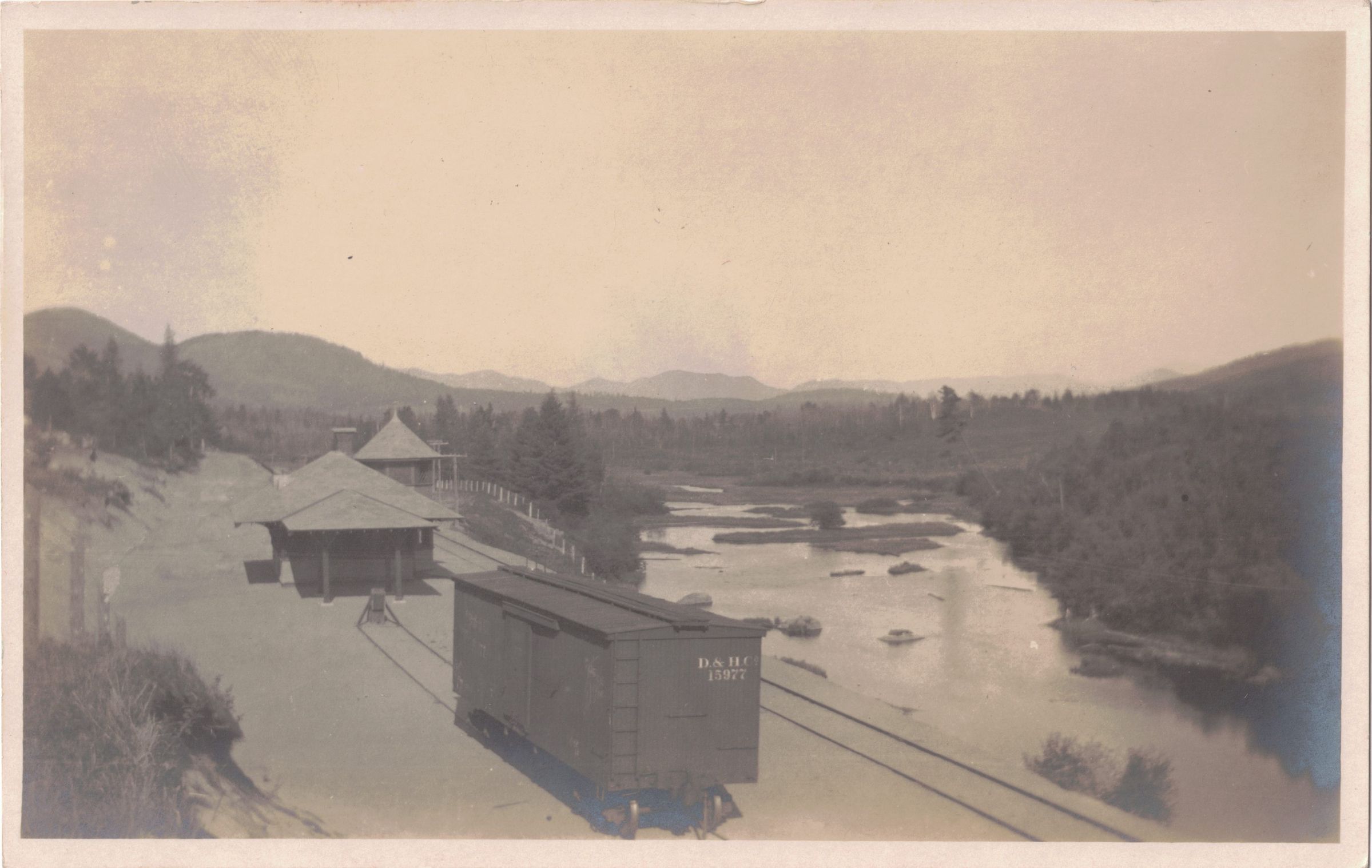 Photograph of the train tracks running next to the water at Ray Brook train station. A boxcar can be seen in the foreground. Printed on blank postcard backing.