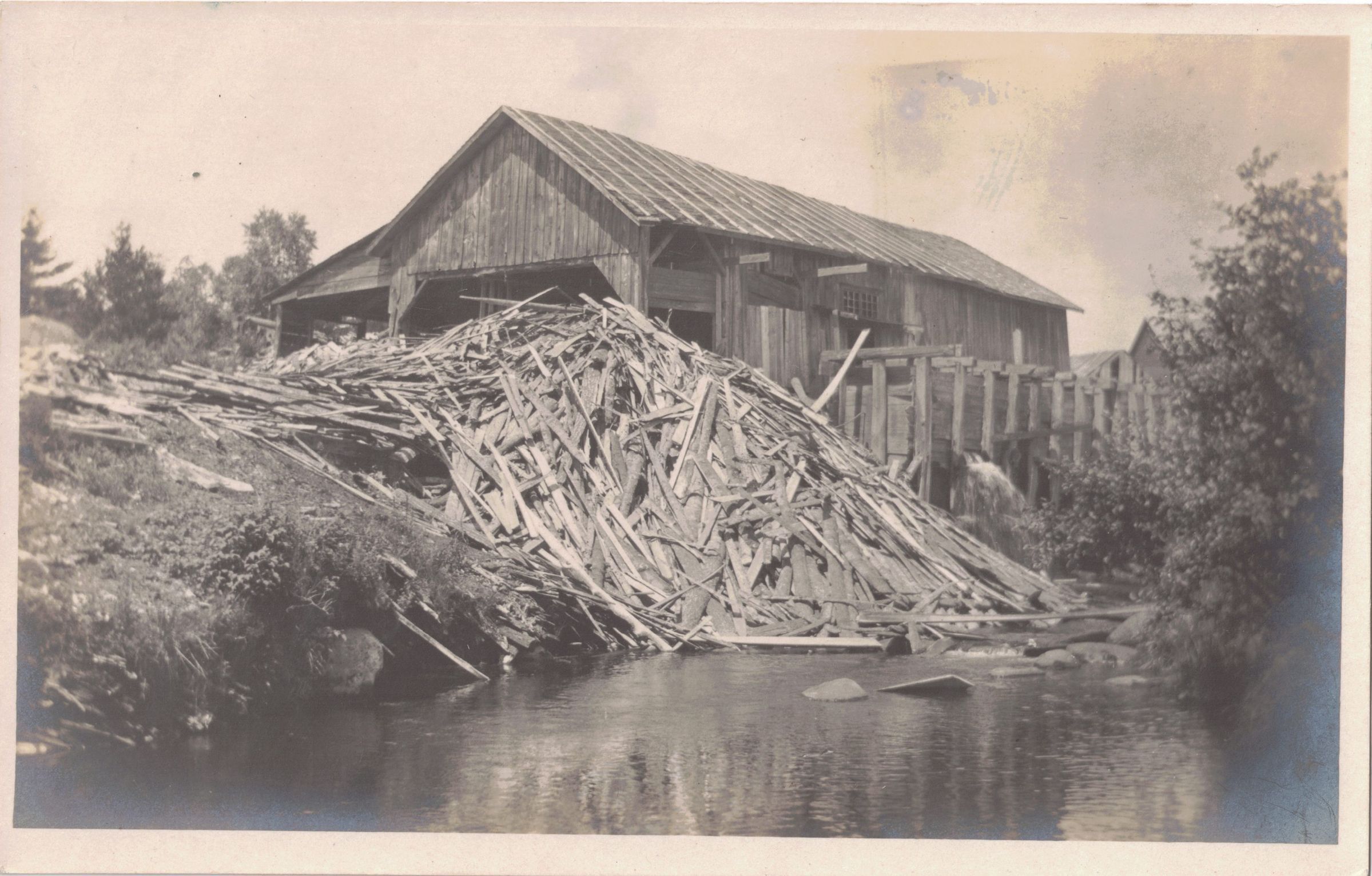 Photograph of a barn-like structure next to a river, with a very large pile of wood leading down to the water. Printed on blank postcard backing.