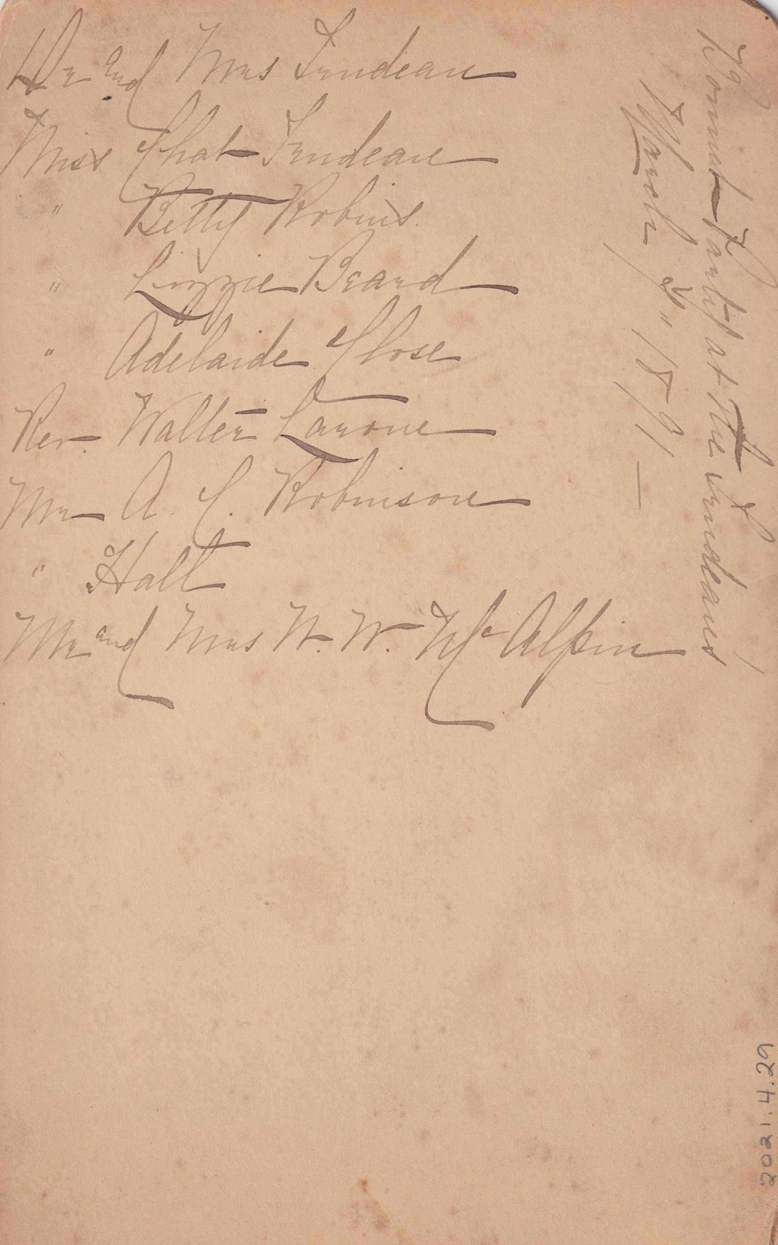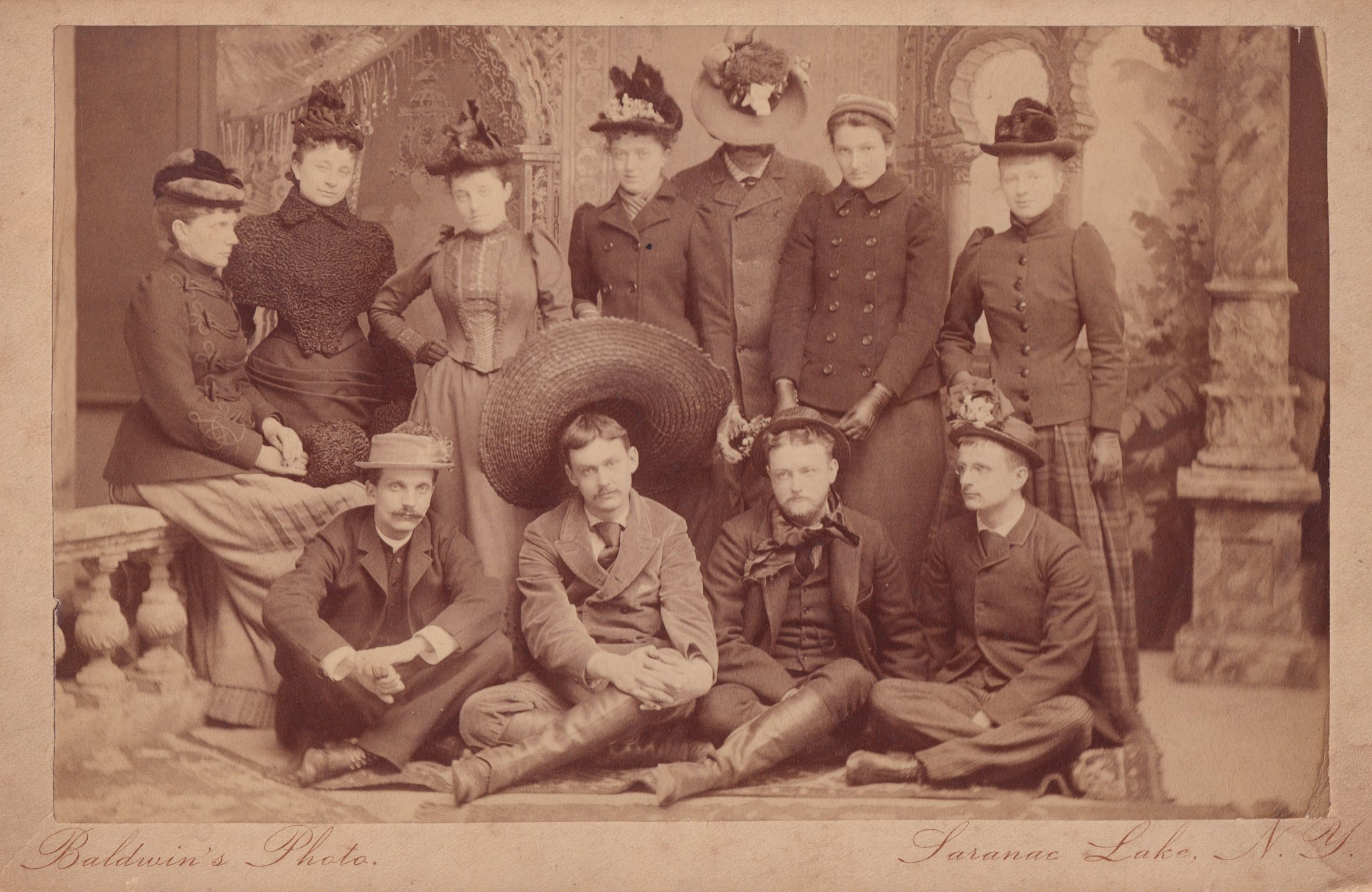 Black-and-white photograph of a group of people in a studio setting; all are wearing hats. Edward Livingston Trudeau is standing in the back row with his hat covering most of his face. Beneath the photograph is printed "Baldwin's Photo Saranac Lake, N.Y." Handwritten note on reverse reads, "Dr. and Mrs. Trudeau, Miss Chat Trudeau, Miss Betty Robins, Miss Lizzie Beard, Miss Adelaide Close, Rev. Walter L[arone?], Mr. A. C. Robinson, Mr. Hall, Mr. and Mrs. W. W. McAlpin." Along the side of the back is also written, "Bonnet Party at the Trudeaus' March 7 1891."Photograph Details