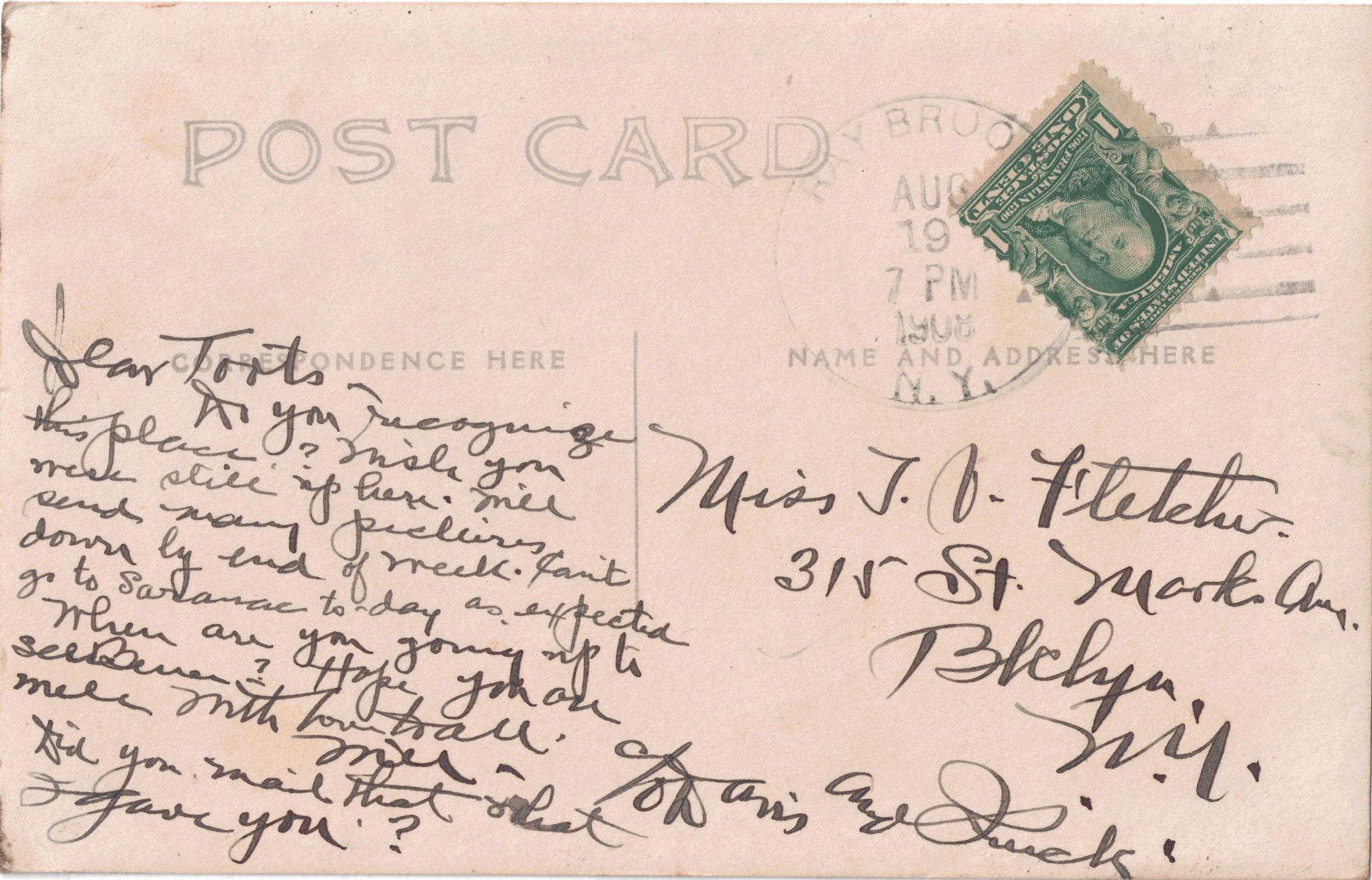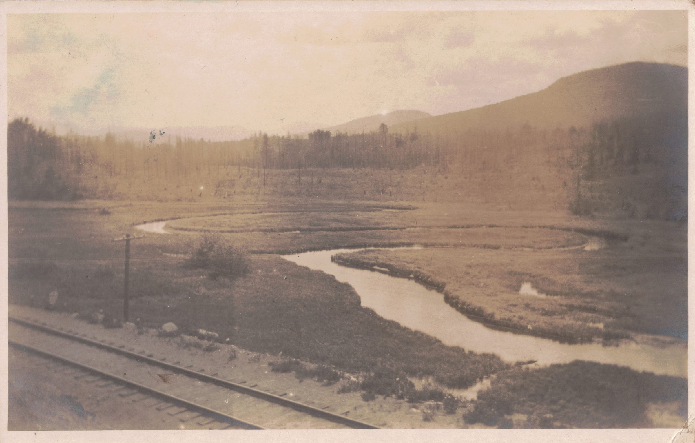 Photograph of the river running through Ray Brook next to the train tracks. Message on postcard backing reads, "Dear Toots, Do you recognize this place? Wish you were still up here. Will send many pictures down by end of week. Can't go to Saranac today as expected. When are you going up to (?)? Hope you are will with love to all. Did you mail that (?) I gave you?" and is addressed to "Miss T.V. Fletcher, 315 St. Mark Ave., Bklyn, N.Y. c/o Davis and Quick".Photograph Details