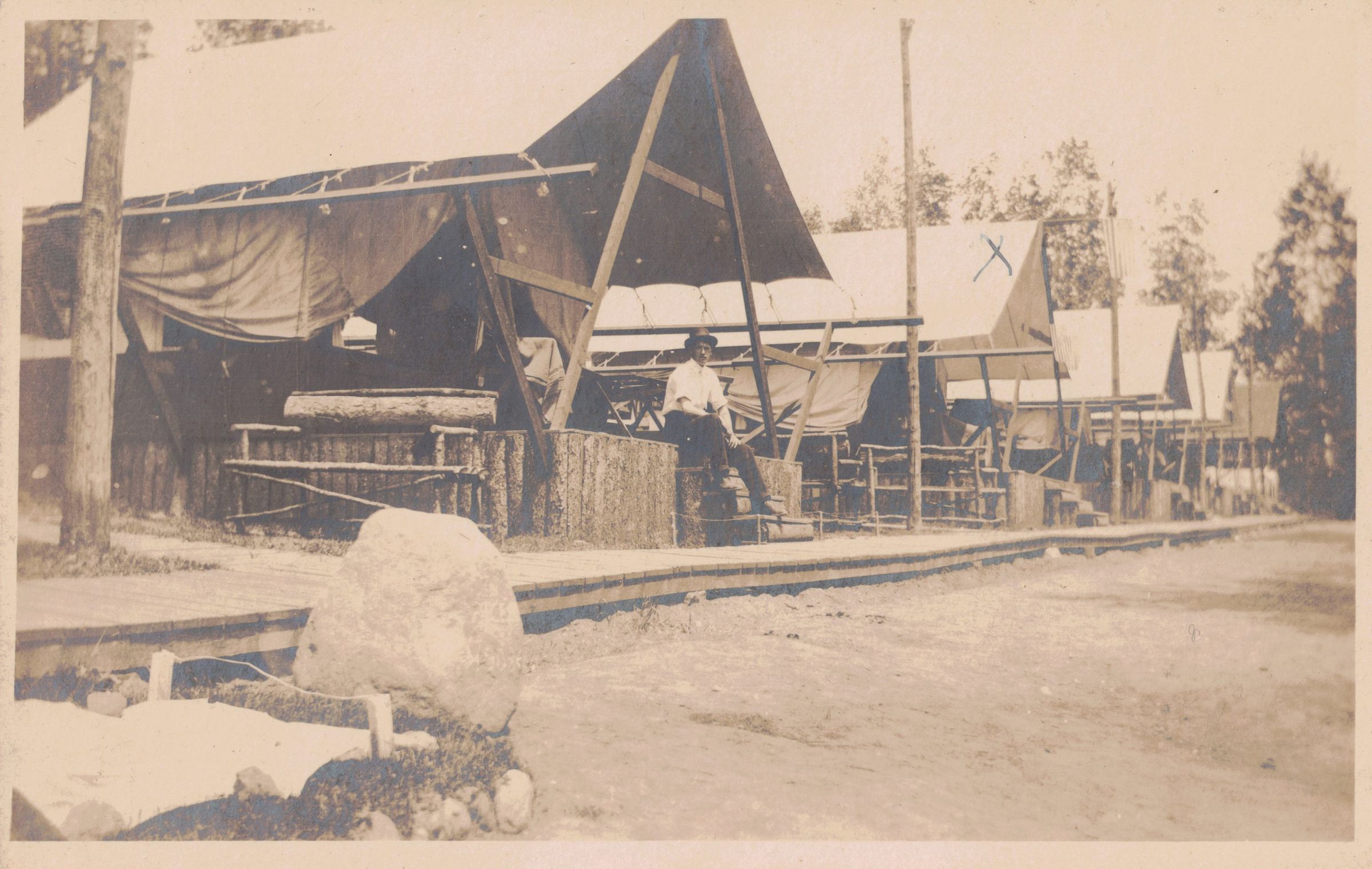 Photograph of a row of tent platforms at the New York State Sanatorium for Incipient Tuberculosis, AKA Ray Brook Sanatorium. The first in the row has an unidentified man sitting on the steps, and the tent next to it is marked in pen with an "x". Printed on blank postcard backing.Photograph Details