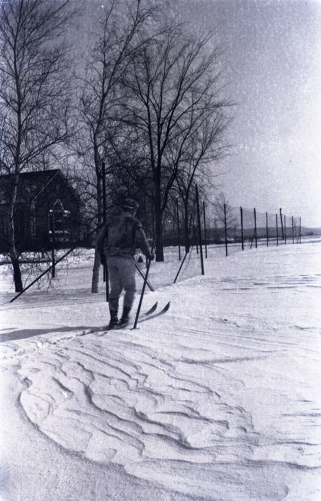 Negative of an unidentified man on skis on an open snow-covered field next to a fence. On the other side of the fence there are trees and a building. Most likely taken by Mary Ives Baldwin. This item is not fully cataloged but has been uploaded so the image is publicly available; if you would like us to prioritize cataloging this item, please contact the HSL Collections team.