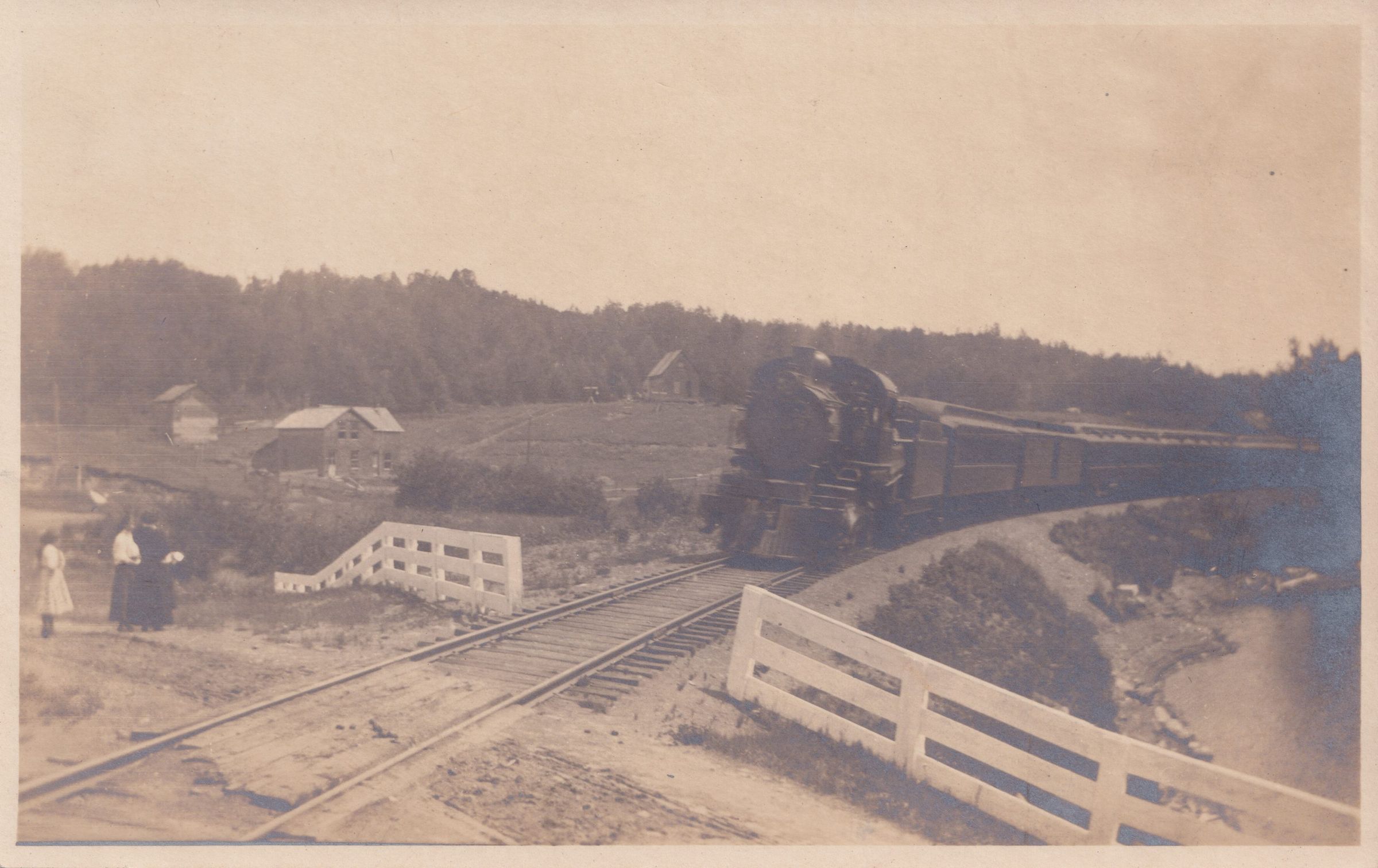 Photograph of a train passing between a fence, with unidentified women standing off to the side. Printed on blank postcard backing.