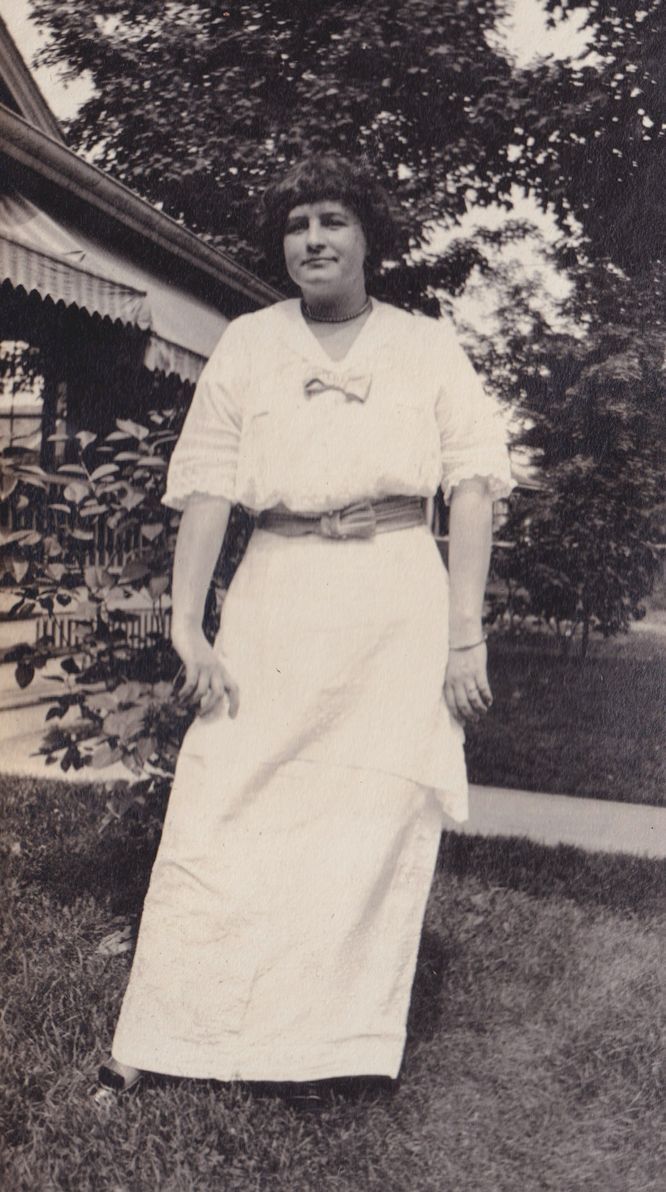 Black-and-white photograph of a woman standing on a lawn in front of a house. The house has a porch with a fabric awning peaking out below the roof.