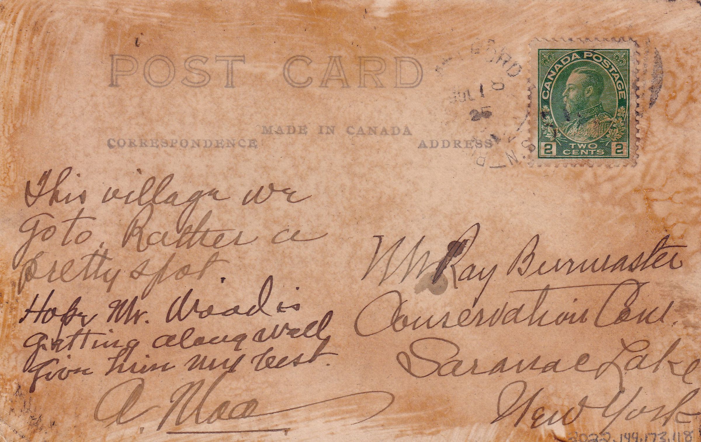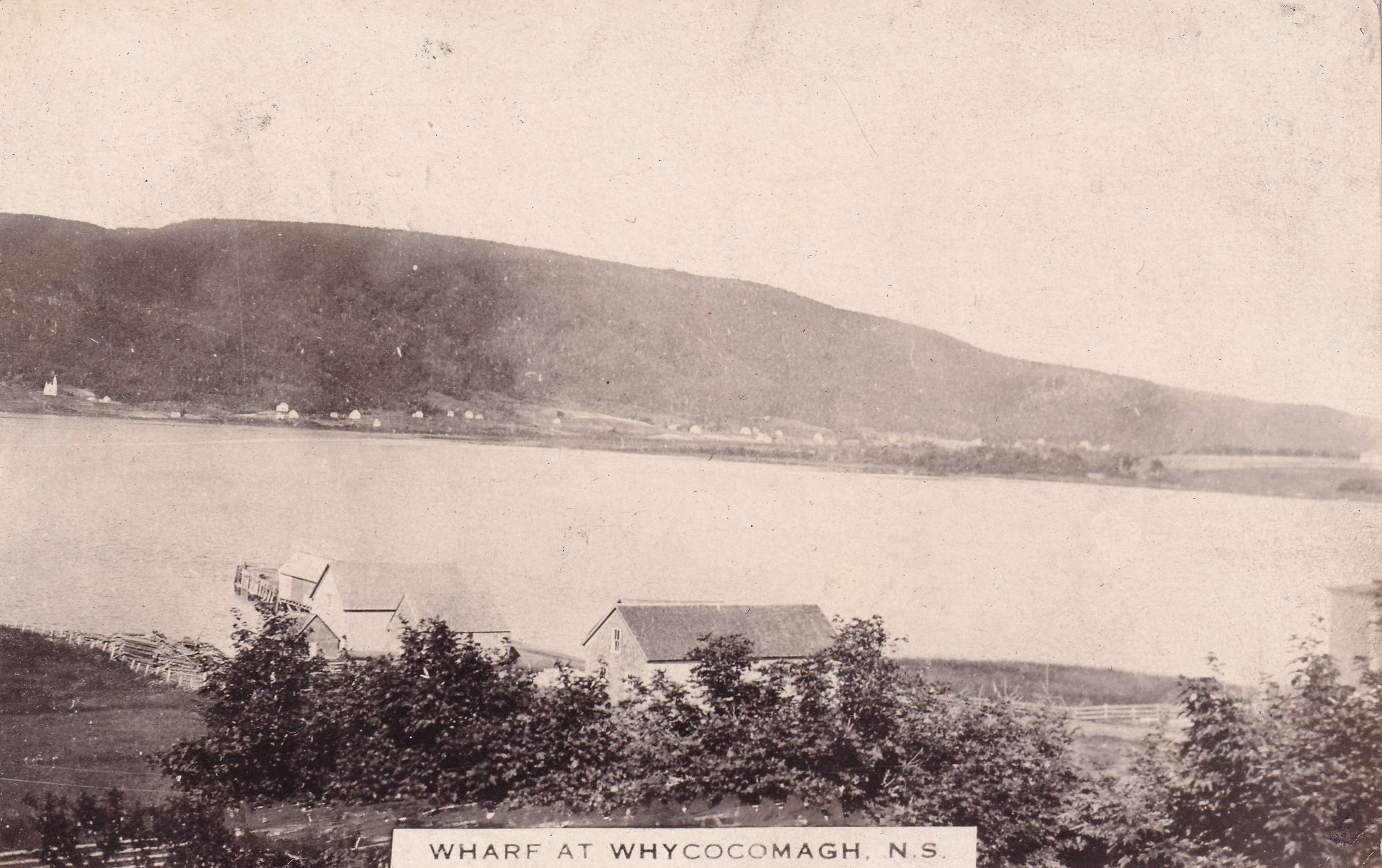 Black-and-White photograph postcard showing buildings and a wharf along a body of water. Printed caption on front reads, "Wharf at Whycocomagh, N. S." No printer's mark. Divided back, postmark illegible. Handwritten message on back reads, "This village we go to. Rather a pretty spot. Hope Mr. Wood is getting along well. Give him my best. A. Mace[?]." Mailed to Mr. Ray Burmaster, Conservation Com., Saranac Lake, New York.Subject Person/Organization