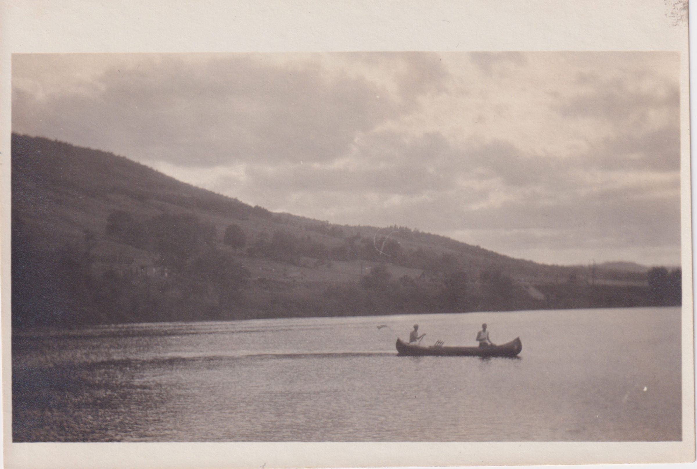 Photograph of two men paddling a canoe with hills in the distance.