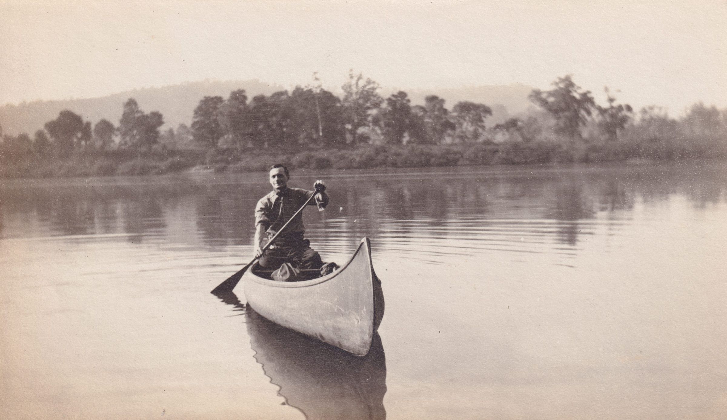 Photograph of William Schuster paddling a canoe. His sleeves are rolled up and his hat sits on the seat in front of him.