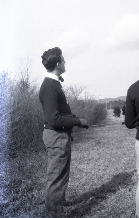Negative of an unidentified man in a sweater with the letter "H" on it. Possibly taken by Mary Ives Baldwin. This item is not fully cataloged but has been uploaded so the image is publicly available; if you would like us to prioritize cataloging this item, please contact the HSL Collections team.
