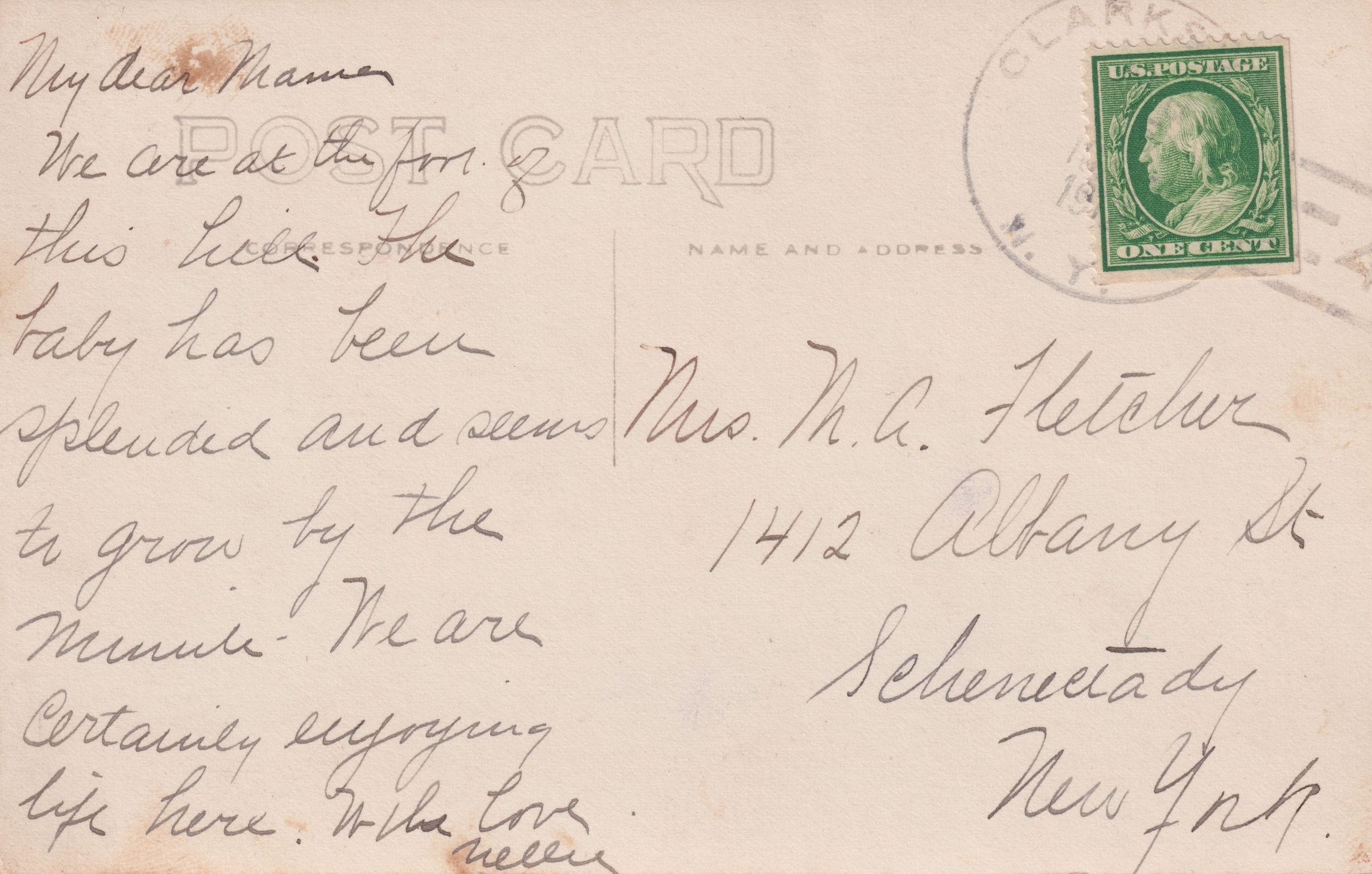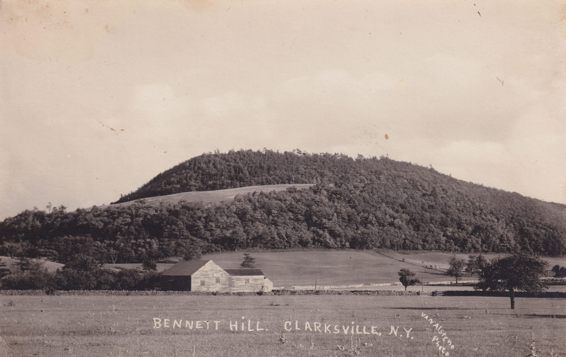 Photograph of a house sitting in the hills. Location is labeled as "Bennett Hill Clarksville, N.Y. Van Alstene Photo." Message on postcard backing reads, "My dear Mama, We are at the foot of this hill. The baby has been splendid and seems to grow by the minute. We are certainly enjoying life here. With love, Nellie." It is addressed to, "Mrs. M.A. Fletcher, 1412 Albany St, Schenectady, New York."Photograph Details