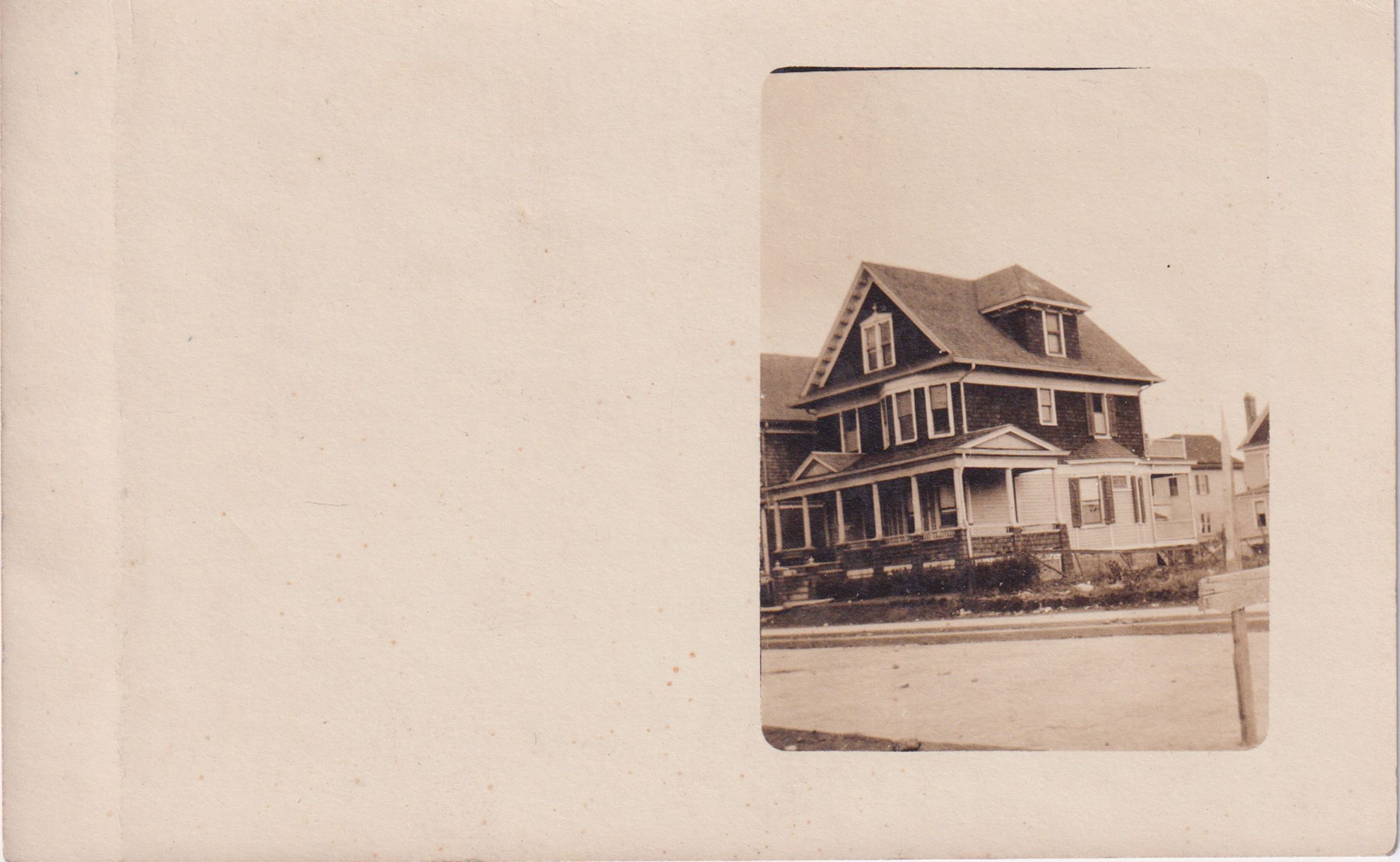 Photograph of an unidentified house printed on blank postcard backing. There is a large amount of white space on the front of the card.