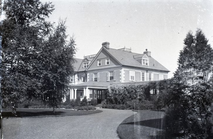Negative of a brick and plaster building with a manicured lawn, driveway, and line of hedges. Most likely taken by Mary Ives Baldwin. This item is not fully cataloged but has been uploaded so the image is publicly available; if you would like us to prioritize cataloging this item, please contact the HSL Collections team.