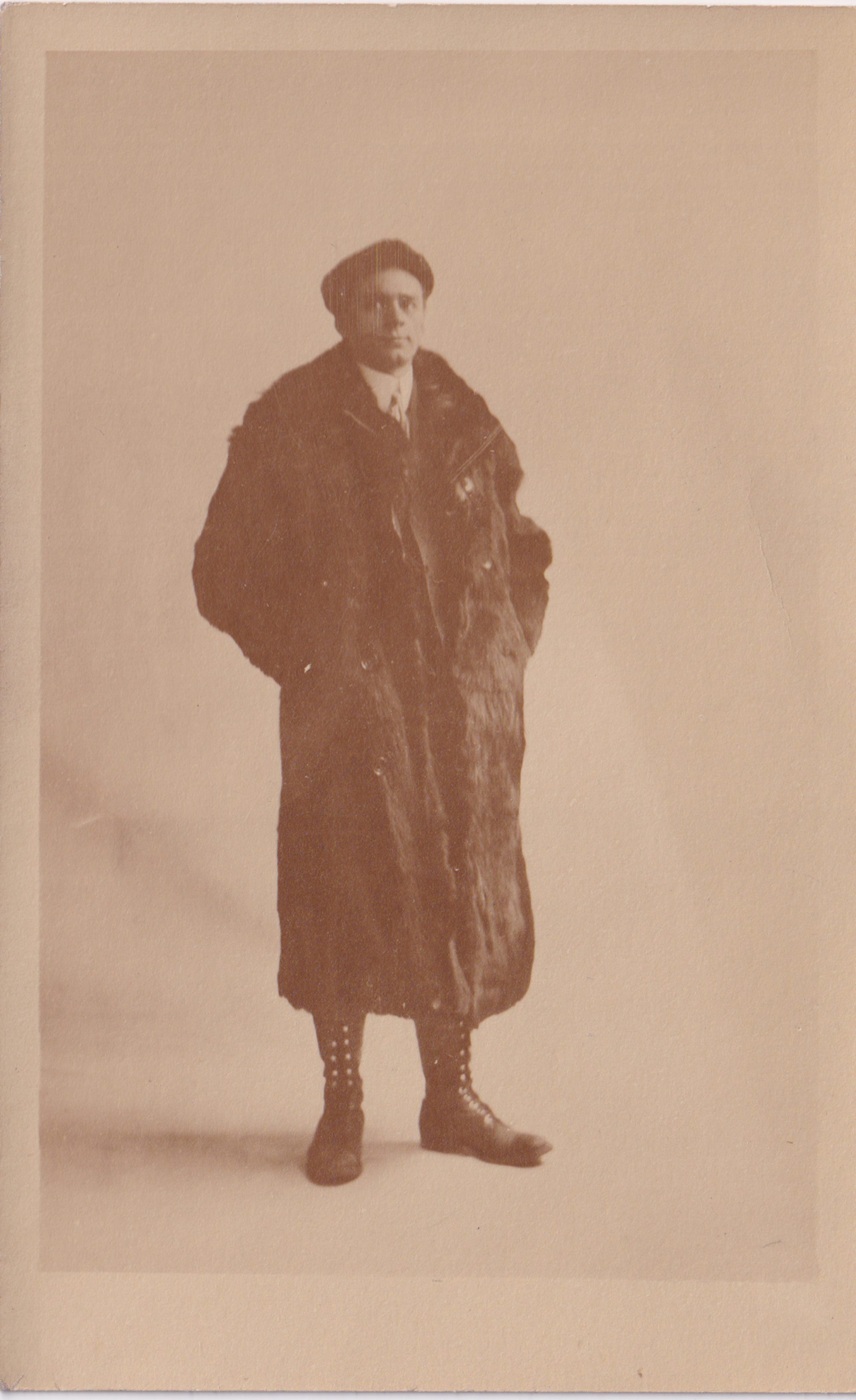 Portrait of William Schuster in a long fur coat, hat, and laced up boots. Printed on blank postcard backing.Photograph Details