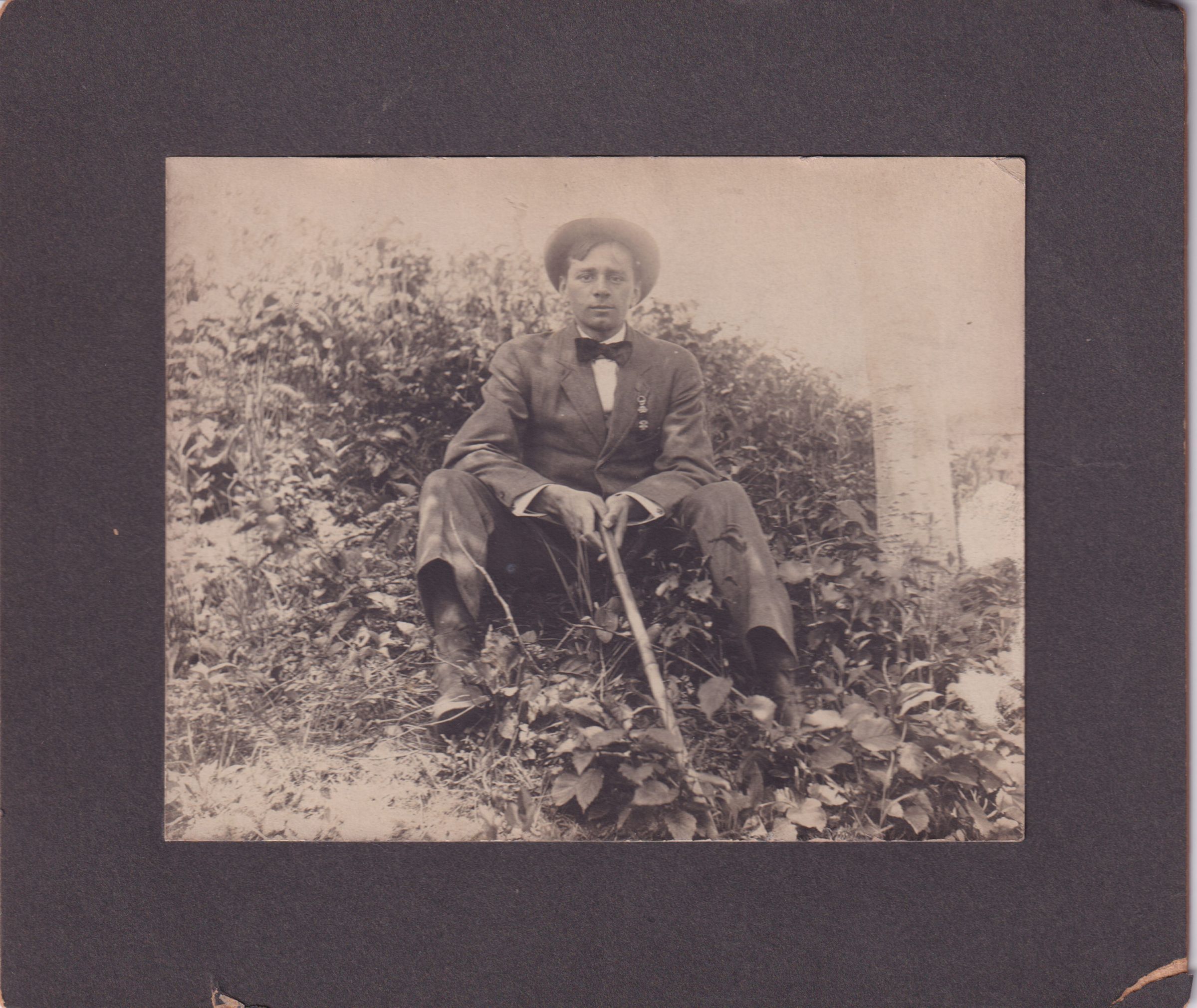 Photograph of William J. Schuster sitting in the grass in a hat and suit, holding a cane.