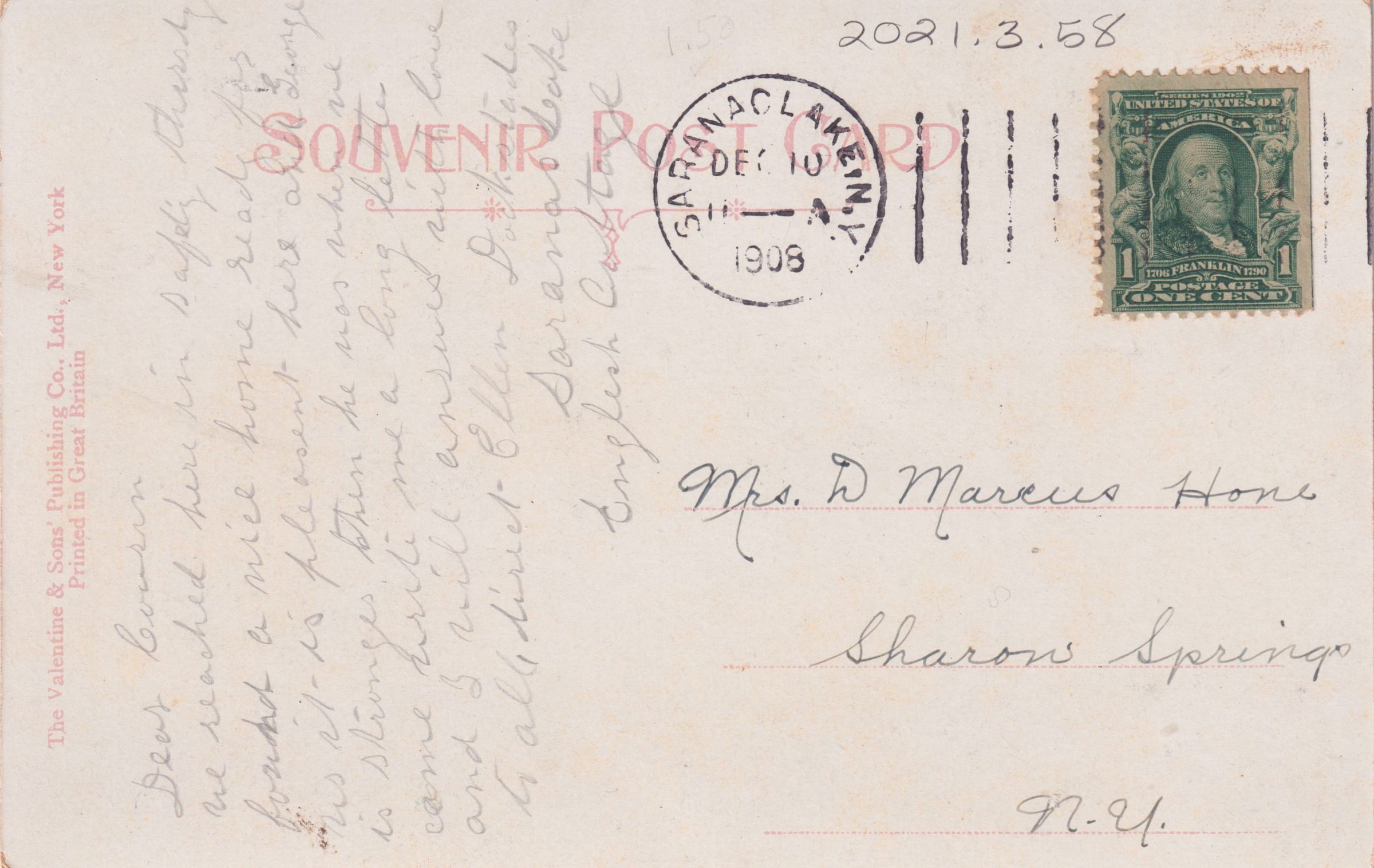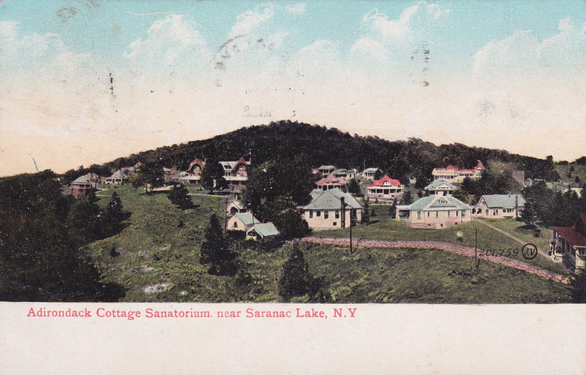 Color postcard showing the campus of the Adirondack Cottage Sanitarium [later Trudeau Sanatorium] from a distance. Three tent platforms can be seen at the front edge of the campus. There is white space at bottom for writing message. Printed caption on front reads, "Adirondack Cottage Sanatorium near Saranac Lake, N. Y." Used, undivided back, postmarked December 10, 1908. Printed by the Valentine & Sons' Publishing Co., Ltd., New York. Handwritten caption on the front reads, "Dear Cousin, We reached here in safety Thursday, found a nice home ready for us it is pleasant here and George is stronger than he was when we came write me a long letter and I will answer with love to all direct Ellen Dackstades, English Cottage." Mailed to Mrs. D Marcus Hone, Sharon Springs, N. Y.Subject Place
