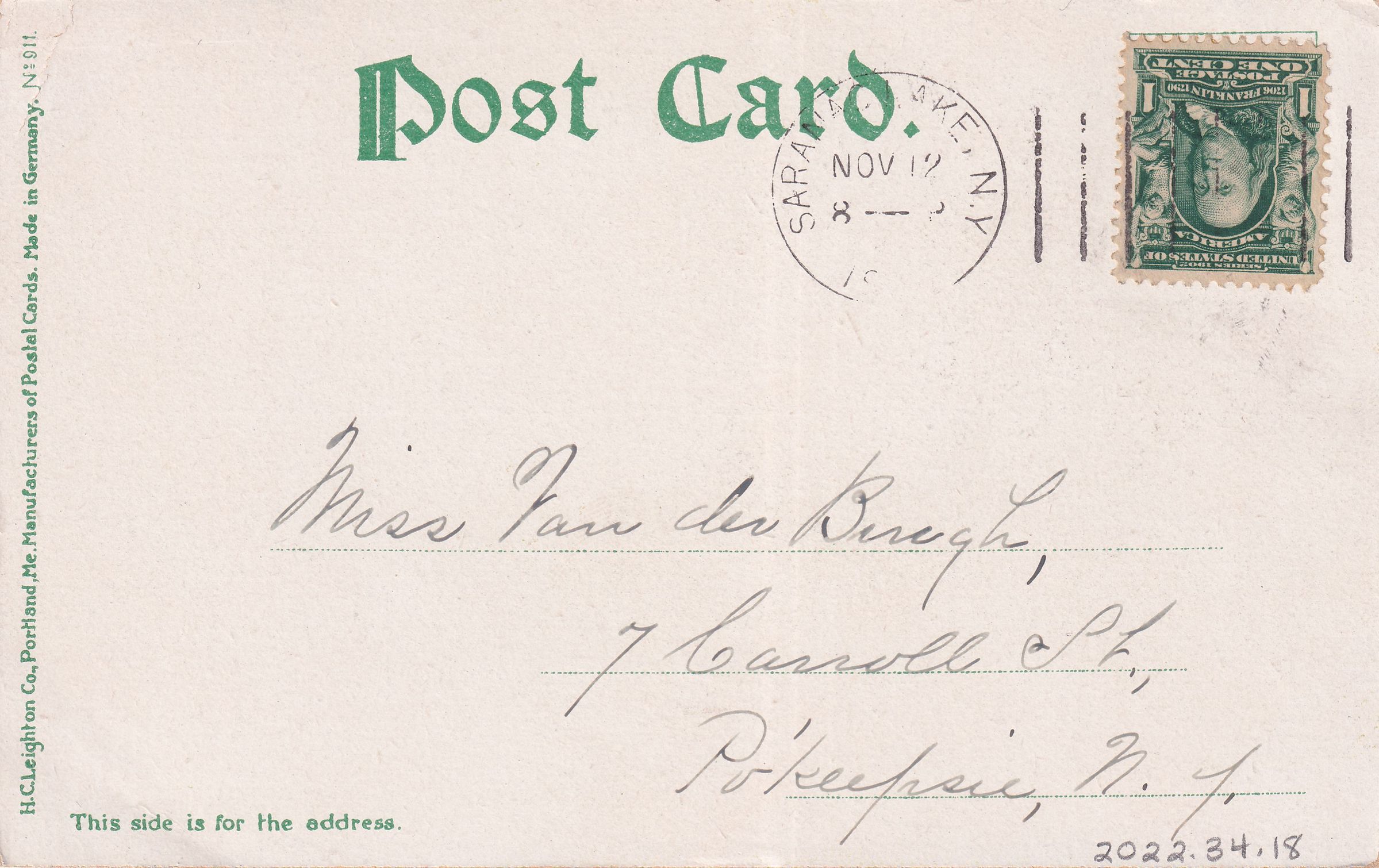 Color postcard showing a snowy reoad through the woods. A horse-drawn sleigh can be seen moving down the road. Printed caption on front reads, "Adirondack Mountains, Bloomingdale Road in Winter." Printed by H. C. Leighton Co., Portland, ME. Used, undivided back, white text box on front right, postmarked Saranac Lake, November 12, 19[??]. Handwritten message on front reads, "This is how we shall look very soon. L. C. N." Mailed to Miss Van der Burgh, 7 Carroll St., Po'Keepsie, NY.Subject Place