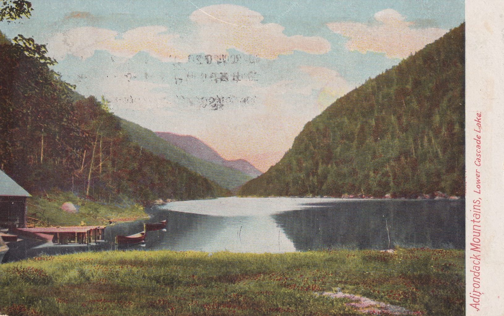 Color postcard showing a boathouse along Lower Cascade Lake. Printed caption on front reads, "Adirondack Mountains, Lower Cascade Lakes." Printed by the Hugh C. Leighton Co., Manufacturers, Portland, ME. Used, divided back, white space on front for message, postmarked Saranac Lake, November 20, 1907. Handwritten message on reverse reads, "Nov. 20, 1907. Dear Mrs. Crooks, I hope ere this your homesickness has vanished. We all get it and must put both feet down on it. Mr. Maxwell is much better but still in bed. Mr. Morton getting more and more inclined for the "old country" and Mr. Honig still lectures on financial situation. I feel a little better too. So all is joy unalloyed. Yes, it's fumed [?]. A. Douglas. Mr. H & Martin gave Norman pair of boots and sled for birthday. He's happy." Mailed to Mrs. E. Crooks, Stony Wold San, Lake Kushaqua, N.Y.Collection