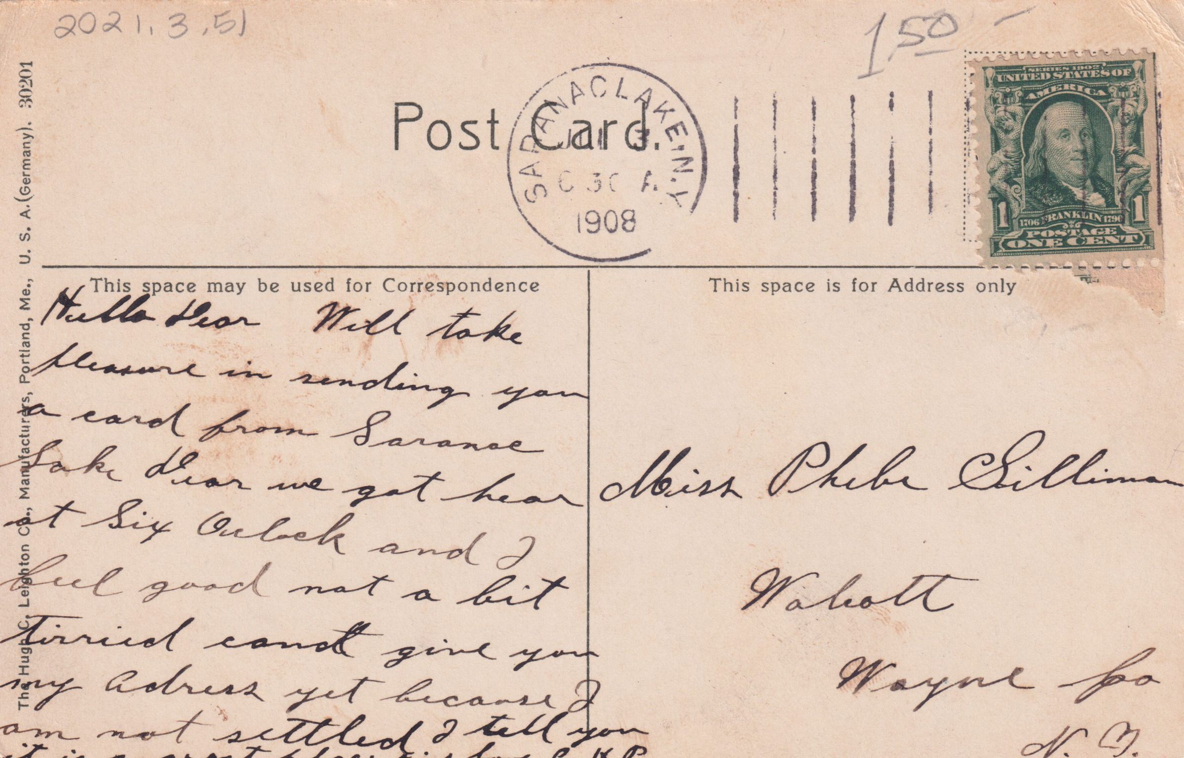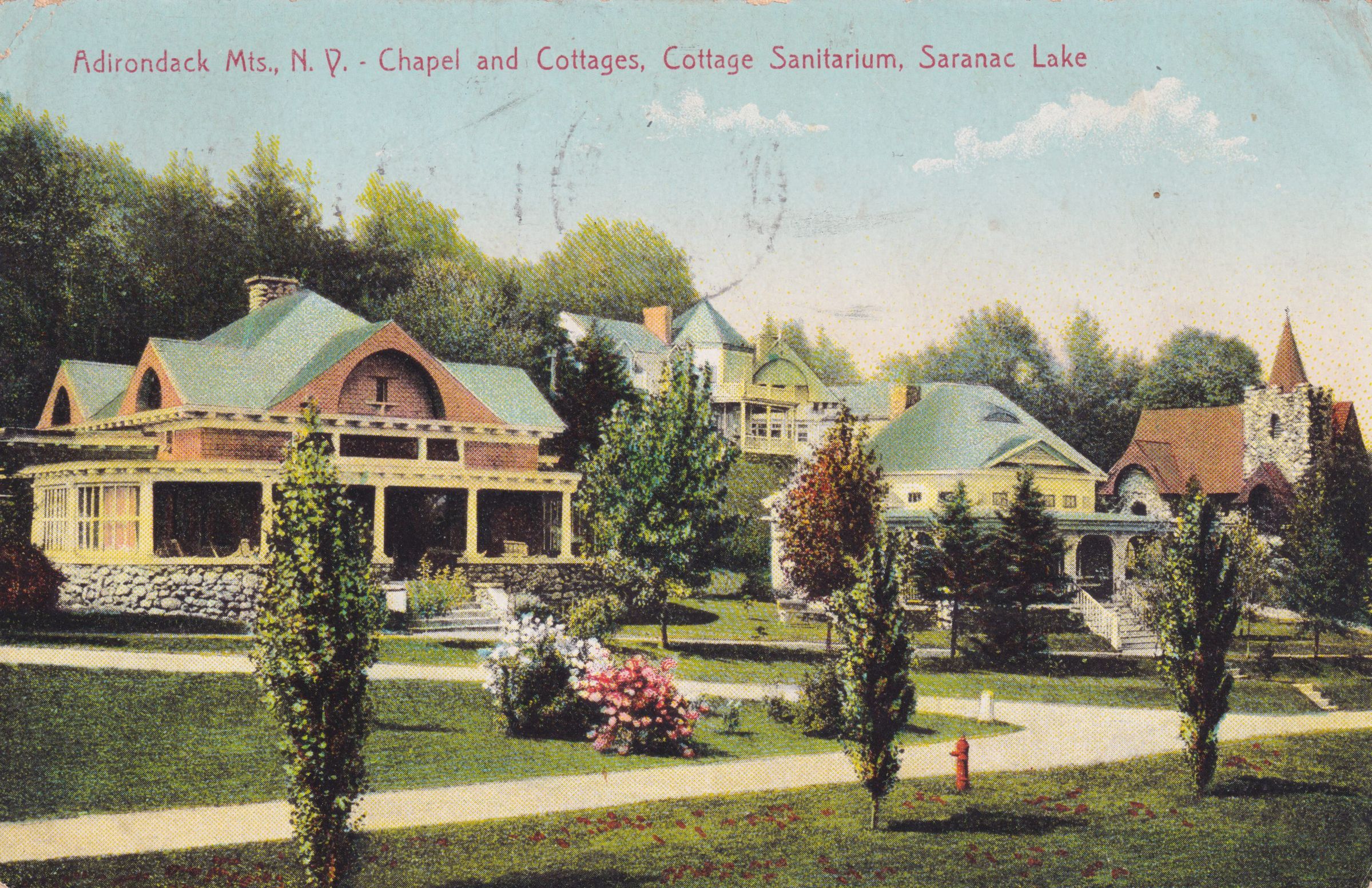 Color postcard showing cottages and chapel at the Adirondack Cottage Sanitarium [later Trudeau Sanatorium]. Ladd Cottage, Anderson Cottage, and Baker Memorial Chapel are visible with Childs Memorial Infirmary in the background. Printed caption on the front reads, "Adirondack Mts., N. Y. - Chapel and Cottages, Cottage Sanitarium, Saranac Lake." Used, divided back, postmarked July 3, 1908, Saranac Lake, NY. Printed by the Hugh C. Leighton Co., Portland, ME. Handwritten message on the back reads, "Hello Dear. Will take pleasure in sending you a card from Saranac Lake. We got here at six o'clock and I feel good not a bit tired. Can't give you my address yet because I am not settled. I tell you it is a great place. Much love, A.H. P." Mailed to Miss Phoebe Silliman, Wolcott, Wayne Co, N. Y.Subject Place