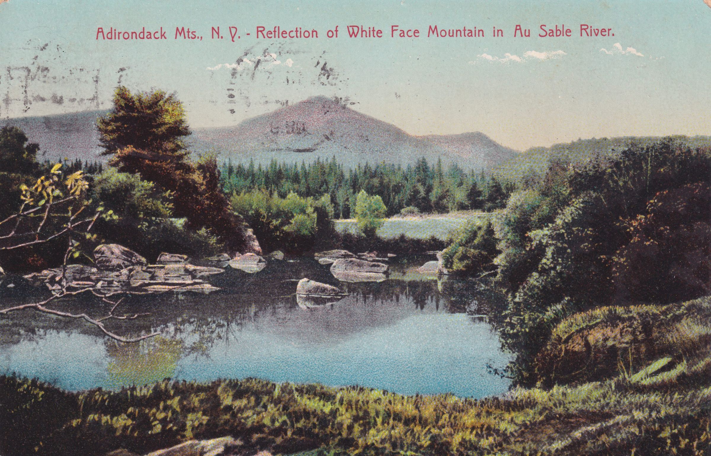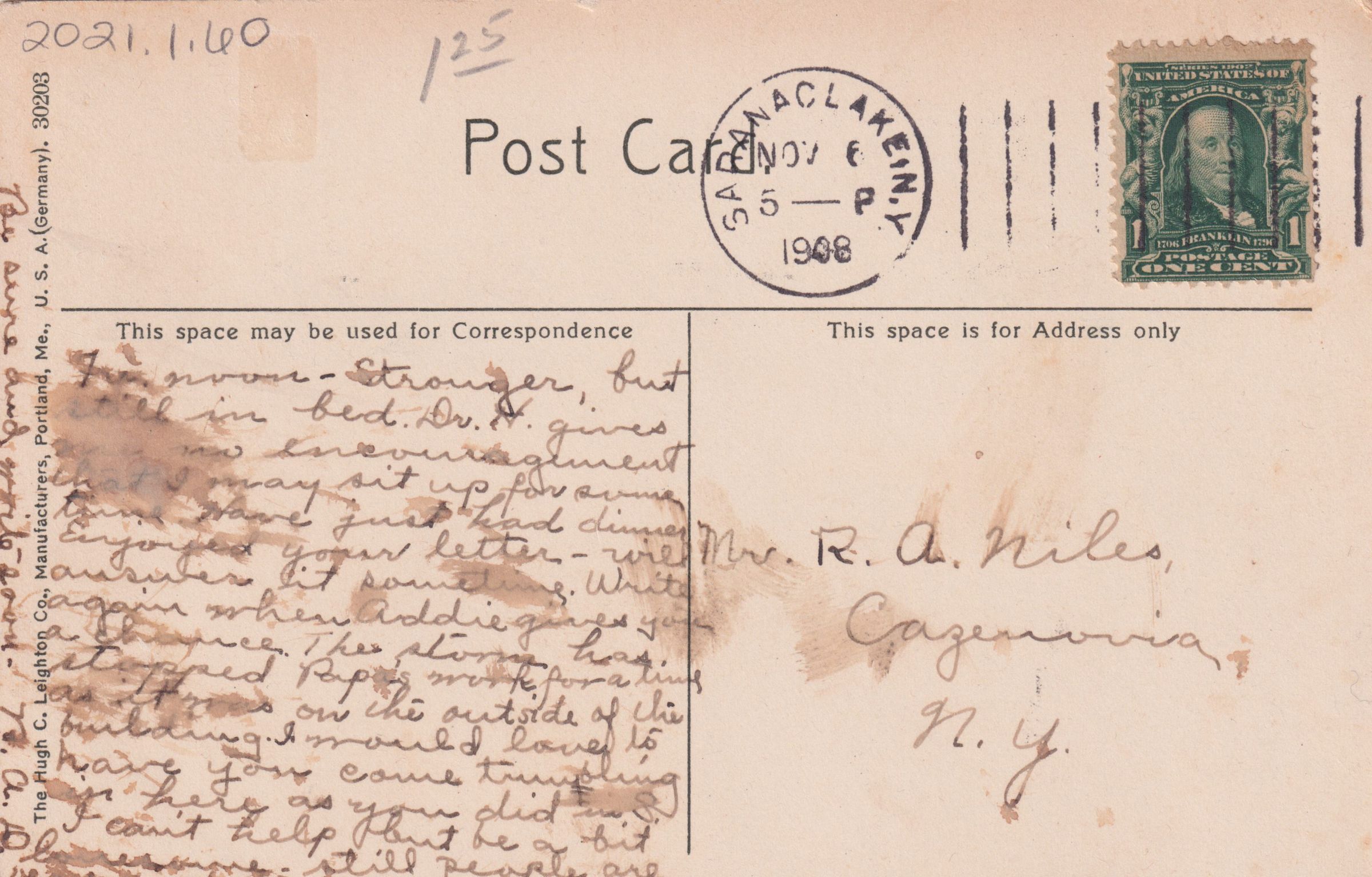 Color postcard showing a scene of a river surrounded by foliage with a mountain range in the background. The printed caption on the front reads, "Adirondack Mts., N. Y. Reflection of White Face Mountain in Au Sable River." Used, divided back, postmarked November 6, 1908, Saranac Lake, NY. Printed by the Hugh C. Leighton Co., Manufacturers, Portland, Me. Handwritten message on back reads, "Friday Noon. Stronger but still in bed. Dr. H. gives me no encouragement that I may sit up for some time. Have just had dinner. Enjoyed your letter, will answer it sometime. Write again when Addie gives you a chance. The storms have stopped Papa's work for a time as it was on the outside of this building. I would love to have you come tumbling in here as you did in S. I can't help but be a bit lonesome. Still people are very kind to me. Be sure and write soon. B.A.D." Mailed to Mr. R. A. Niles, Cazenovia, N. Y.Subject Place